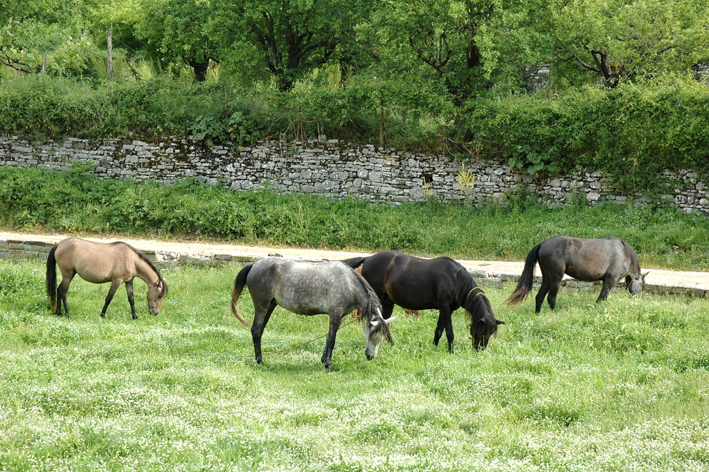 Das Land ist hügelig. Granitgraue Felsen wechseln sich mit zartgrünen Wiesen und blauschimmernden Seen ab. Atemberaubend stürzen sich dort die Wände in die Tiefe der Schluchten. Es ist die Einsamkeit der Bergwelt, in die wir uns begeben und die den Kontrast bildet zum quirligen Ioannina am Westufer des Pamvotissees, aus dem die Klosterinsel Nisi herausragt.