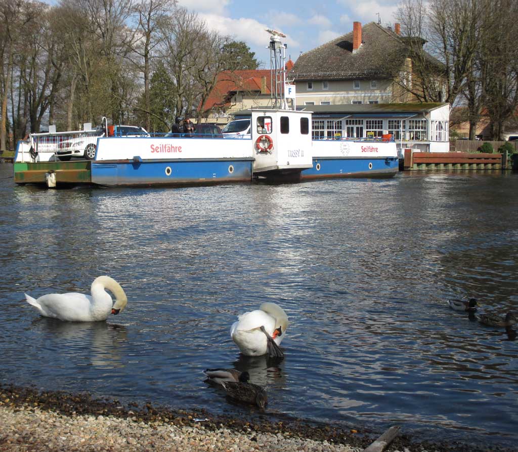 Die Sonne scheint. Es ist warm und schon etwas später am Nachmittag. Feierabendverkehr setzt ein. Während das Schwanenpaar, das sein Gefieder säubert, und die Entenfamilie, die in Reih‘ und Glied langsam ihres Weges zieht, auf der Havel Müßiggang pflegen, haben Fährmann Karsten Grunow und sein Team jetzt alle Hände voll zu tun. Immer wieder legen sie mit ihrer Seilfähre Tussy II – sie heißt wirklich so, Tussy I hat als Technikdenkmal in Sichtweite längst festen Boden unterm Rumpf – die gut 80 Meter vom Schwielower Ortsteil Geltow nach Caputh zurück und umgekehrt.
