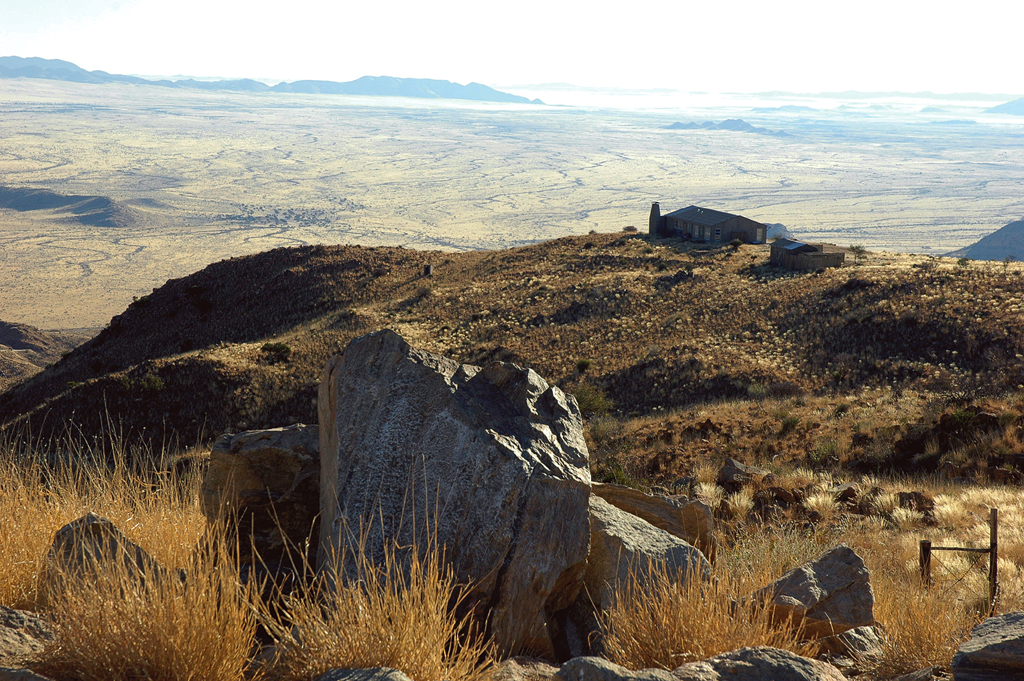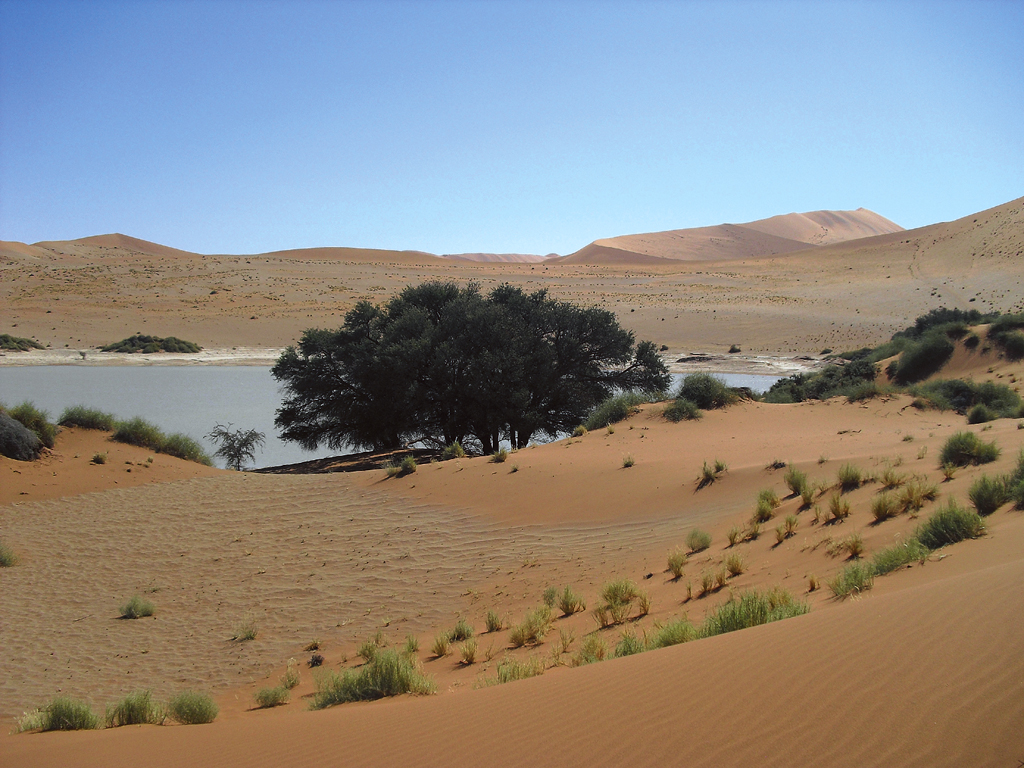 Es ist die letzte Woche im Juli. Wir wagen im namibischen Winter bei Temperaturen um die 30 Grad den Aufstieg auf eine von ihnen. Der Gipfelsturm gelingt, auch wenn die Schritte immer schwerer werden, je mehr wir der Spitze kommen. Jürgen erklärt, Regen sei selten hier, „aber wenn er heftig fällt, füllt sich mitunter sogar die Senke da unten“. Durch die lehmigen Schichten, die kaum Wasser durchließen, bilde sich ein „türkisblauer See, der dann zumindest eine Weile bestehen bleibt.“