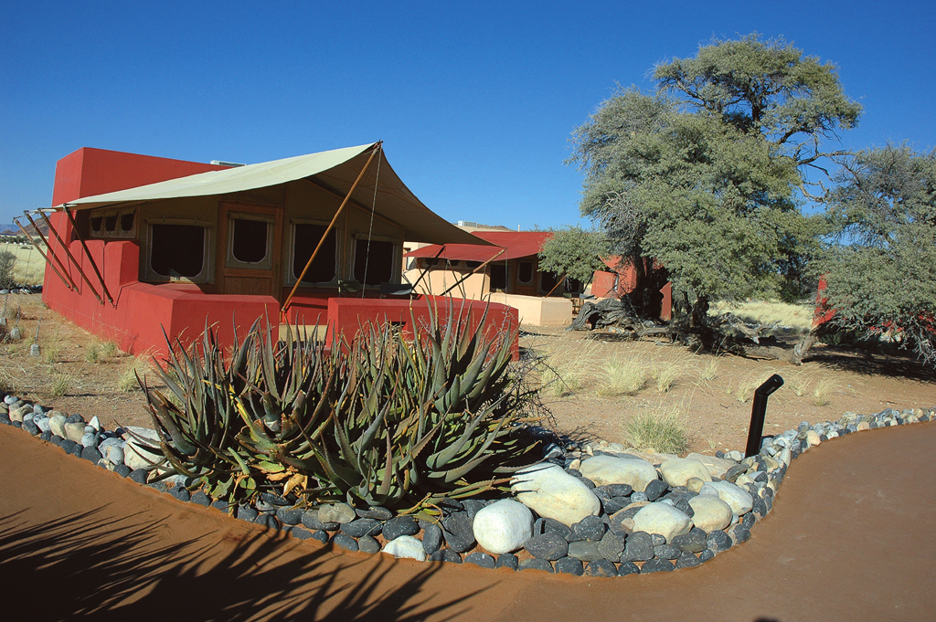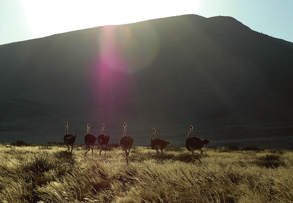 Vom etwa in der Mitte des Landes gelegenen Windhoek geht es zunächst südwestlich Richtung Gamsberg und dann weiter über Nauchas, den Spreetshoogte Pass, Solitaire und die Maltahöhe nach Sesriem. Springböcke und Strauße tauchen vereinzelt auf in der schier endlosen Weite des Landes. In Akazienbäumen haben Webervögel ihre riesigen Nester gebaut. Die Passstraße windet sich in Schlangenlinien die Randstufen hinab. An den Hängen in den Schluchten und auf den vom Hochplateau in die Ebene auslaufenden Hügeln stehen vereinzelt Köcherbäume. Nach rund 250 Kilometern, einem Steinschlag, der einen Riss auf der Windschutzscheibe unseres Yeti, Wagen 3, verursacht hat, und mit einem Reifen, dem die Luft auszugehen droht, kommen wir kurz vor Sonnenuntergang in der Sossusvlei Lodge an.