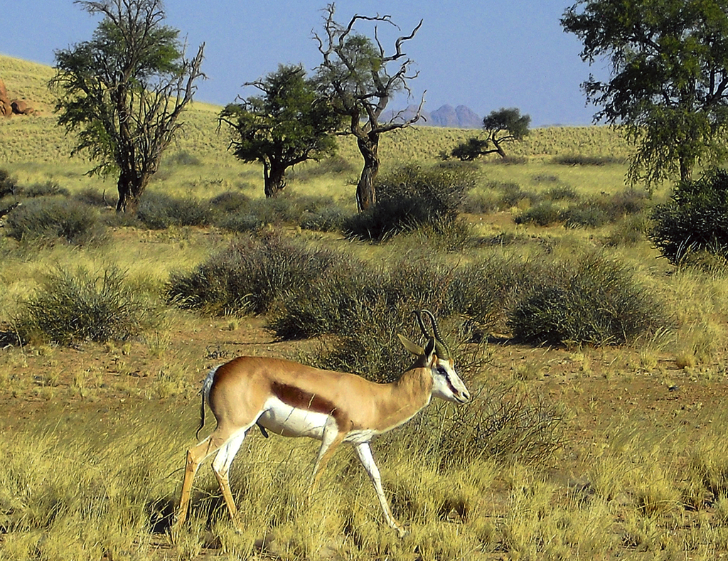 Die Bedingungen sind extrem. Trotzdem finden sich viele an die Wüste angepasste Lebewesen im Sossusvlei, Säugetiere wie Spieß-, Springbock und Goldmull, Käfer wie der „Nebeltrinker“, Schlangen wie die Puffotter. Kameldornbäume wachsen über unterirdischen Wasseradern. Letzte Meldung bereits vor unserer Abreise in Deutschland: „Forscher finden gigantischen See unter der Wüste in Namibia.“ Unser Busfahrer, schon am Flughafen angesprochen darauf, findet nur ein Wort dafür: „Schön!“