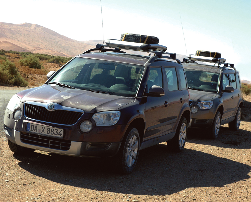 Jürgen Kampf übernimmt uns im Windhoek Country Club. „Wer will“, sagt der Tourleiter, „kann sich noch einmal frisch machen, dann geht’s los.“ Markus Liersch, zuständig bei Škoda in Deutschland für Test und Technik, überprüft die Fahrzeuge, fünf Yeti-Kompakt-SUV, mit denen wir knapp eine Woche rund 1500 Kilometer durch Namibia unterwegs sind, testet die Funkgeräte, die man auf solchen Reisen im Konvoi braucht. Seine Kollegin Elena Funk hilft bei der Einweisung via Karte. Und schon gibt Zelda Lourens von der namibischen Agentur in ihrem „Marshal“ genannten Führungsfahrzeug das Aufbruchsignal: „Ready to go!“