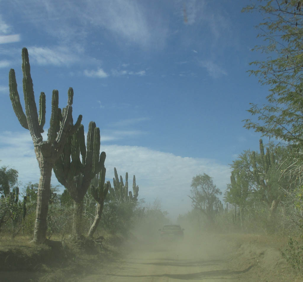 Auf dem Weg zum Pazifik kürzen wir ab, fahren über eine Sandpiste quer durch ein wüstenhaft von riesigen Cardónes-Kakteen bestandenes Gebiet - und handeln uns natürlich sofort einen Plattfuß ein. Doch Vorsicht beim Reifenwechsel! Denn in dieser Gegend soll es nicht nur lustige Roadrunner-Rennkuckucke, sondern auch giftige Klapperschlangen, beutehungrige Kojoten, unberechenbare Leguane und in den Hügeln mitunter sogar noch Pumas, Ozelots und Schwarzbären geben. Es scheint, als beobachte ein Caracara-Falke, der Nationalvogel des Landes, aufmerksam das Tun, aber wenigstens kreisen die Truthahn-Geier noch nicht …