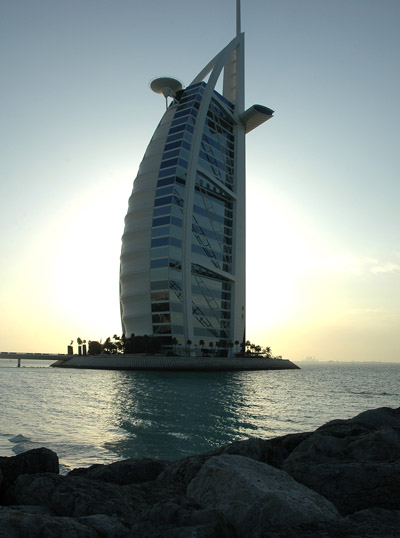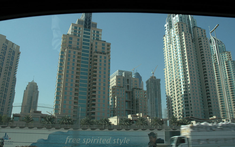 Wir fahren, nach einem Abstecher nach Abu Dhabi, um uns das ehrwürdige „Emirates“-Hotel, die wohl nobelste aller Nobelherbergen, anzuschauen, wieder in Dubai an der „City of Arabia“ vorbei, am neuen Stadtteil „Dubai Marina“ rings um eine drei Kilometer lange künstliche Lagune mit Yachthafen. „Internet City“, „Media City“, „Financial City“ gleiten vorüber, die „Dubai Waterfront“, ein halbkreisförmiges Ensemble von Kanälen und Inseln mit Luxushotels, Villen, Geschäftszentren. Und alles überragt inzwischen vom 828 Meter hohen Burj Khalifa.