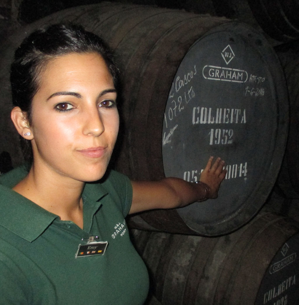 Emy, die uns bei der letzten Station unserer Reise im Vinum des Portweinunternehmens Graham in Vila Nova de Gaia mehr über den Weinanbau im Douro-Tal erklärt, sieht im speziellen Mikroklima und dem besonderen Schieferboden die besten Bedingungen für ein möglichst optimales Heranreifen edler Trauben auf den meist nach Süden hin ausgerichteten Weinbergen. Weil der Boden karg und felsig ist und die Sommer mitunter glühend heiß und trocken sind, würden zwar nur geringere Mengen produziert, „dafür“, sagt Emy, „bringen die Lagen oberhalb des Douro aber auch einige sehr große Weine hervor“.