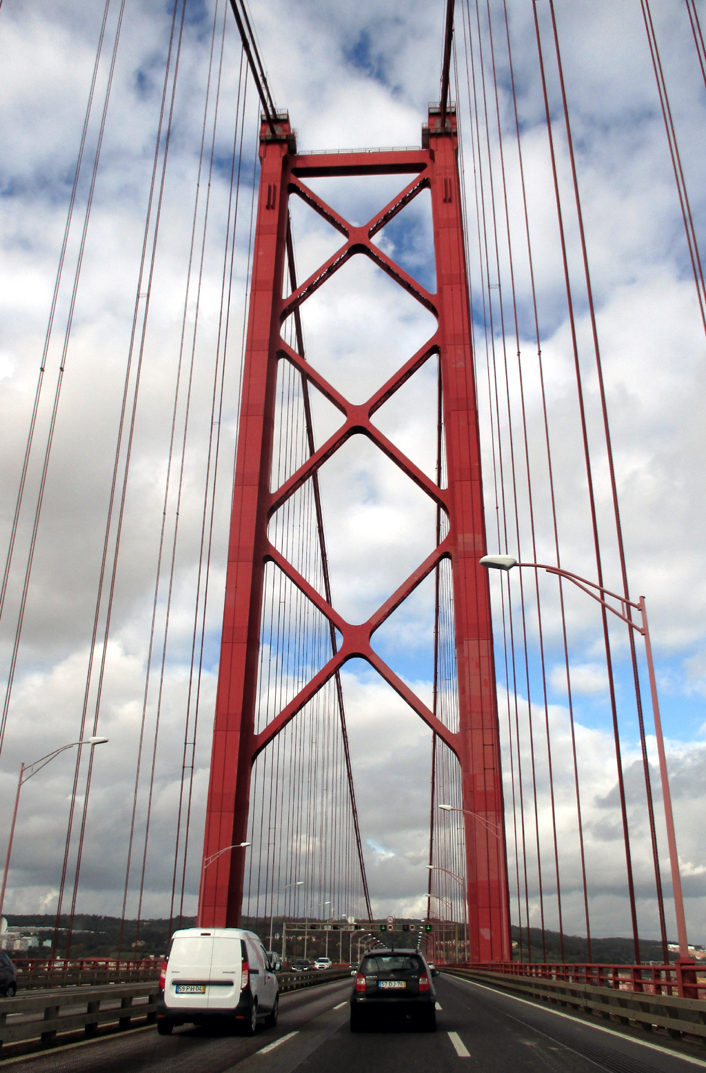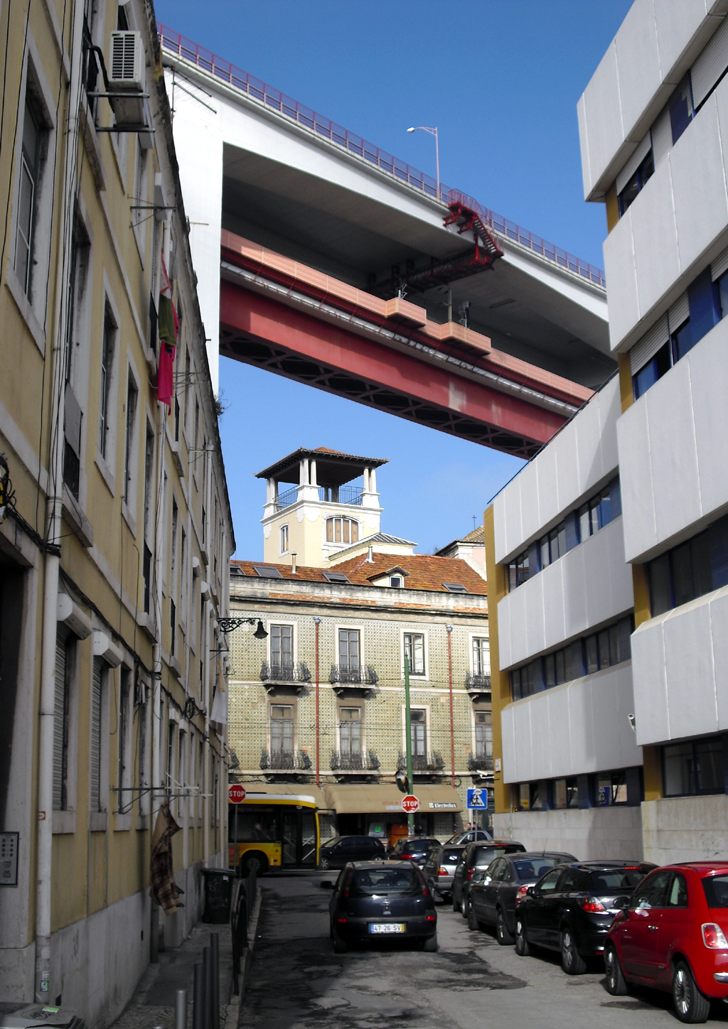 Auch wenn wir diesmal keine der beiden großen Brücken über den Tejo überqueren: Immer wieder eröffnen sich, je höher man sich in Lissabons Altstadt begibt, Blicke auf die markanten Bauwerke: die neuere, mit gut 17 Kilometern die längste Brücke Europas, die Ponte Vasco da Gama beim Parque das Nacoes, dem Gelände der Weltausstellung 1998, und die ältere, die 1966 nach vier Jahren Bauzeit nach der Nelkenrevolution eröffnete Ponte 25 de Abril, deren sanft gebogene Kabel das Gewicht von immerhin mehr als 70 000 Tonnen Stahl zu tragen haben.