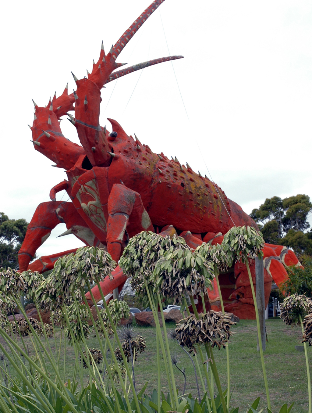 Bei Kingston erreichen wir wieder die Küste. Und Larry, den Lobster, der aus Markus’ Sicht „bedrohliche sieben Meter hoch“ am Straßenrand neben einer Tankstelle mit angeschlossenem Restaurant steht, in dem wir zu Mittag essen. Eine bessere Werbung für sein Hummerlokal als mit dem vier Tonnen schweren Prachtkerl kann Murray Pitt, der Besitzer, gar nicht machen. Markus erzählt er, Larry habe als Touristenattraktion eigentlich auf dem Dach platziert werden sollen, „aber die Leute, die ihn gebaut haben, haben Inches und Feet mit Metern verwechselt“. Und so sei der Lobster eben dreimal so groß geraten wie geplant. Gut, dass der kleine Wombat, dem wir kurz danach am Rand einer Schotterpiste begegnen, Larry nicht zu Gesicht bekommt; der Beutelsäuger, der aussieht wie ein putziger Bär, würde sonst sicher vor Schreck tot umfallen …