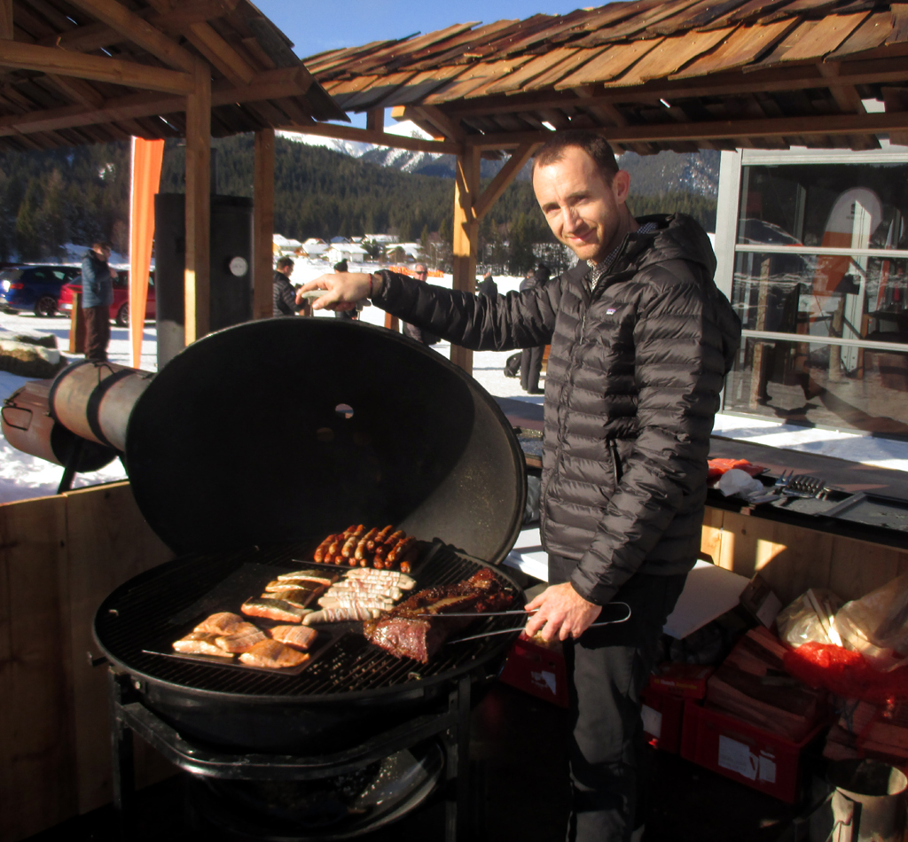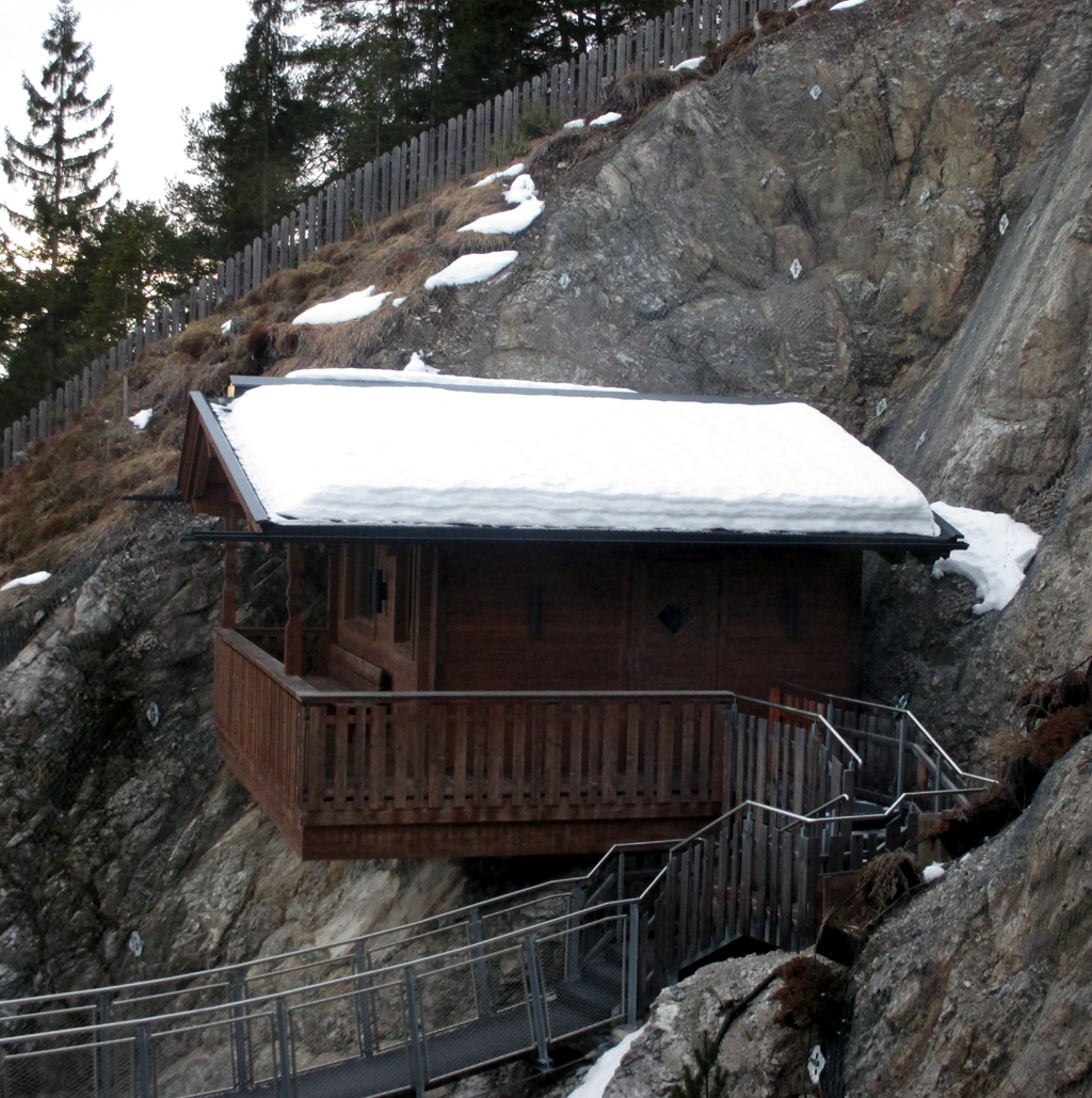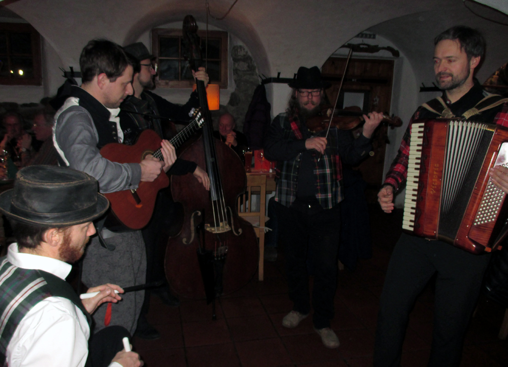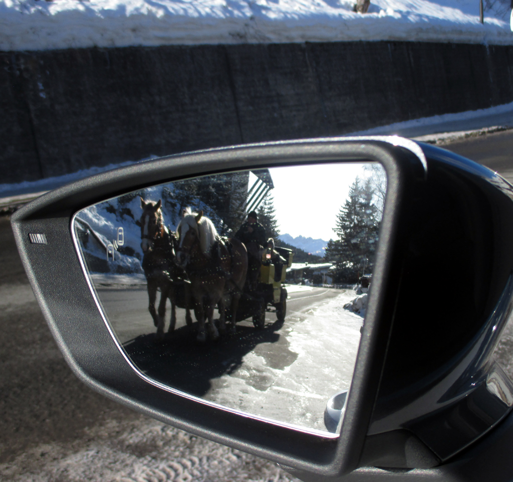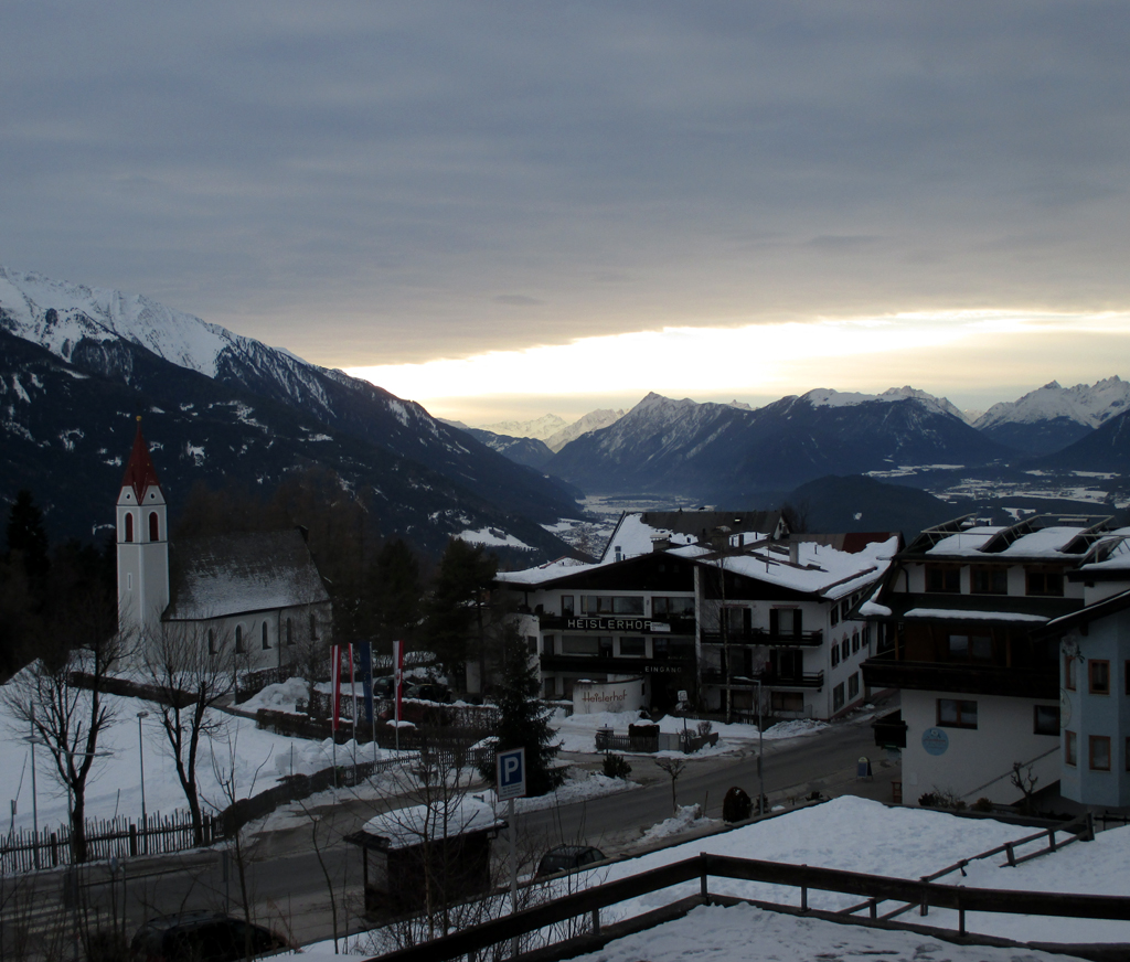 Über dem Wettersteingebirge ziehen im Laufe des späteren Nachmittags erste dunkle Wolken auf. Gut, dass wir nach den „spanischen Drifts“ den Großteil unserer Tiroler Tagestour durch verschneite Täler selbst in höhere Lagen rund um Leutasch schon hinter uns haben. Bereits für den nächsten Tag ist wieder Schnee vorhergesagt, leider ohne Sonne. Für die Kollegen, die nach uns kommen, wird es nicht leicht, im Flieger wieder von Innsbruck aus nach Hause zu starten. Zwölf Kilometer sind es bis Mösern, wo wir uns im Hotel Nidum einquartieren, abends mit Fackeln über dem Inntal in Telfs-Buchen in die Ropferstub’m, einen alten Bergbauernhof aus dem 19. Jahrhundert, marschieren.