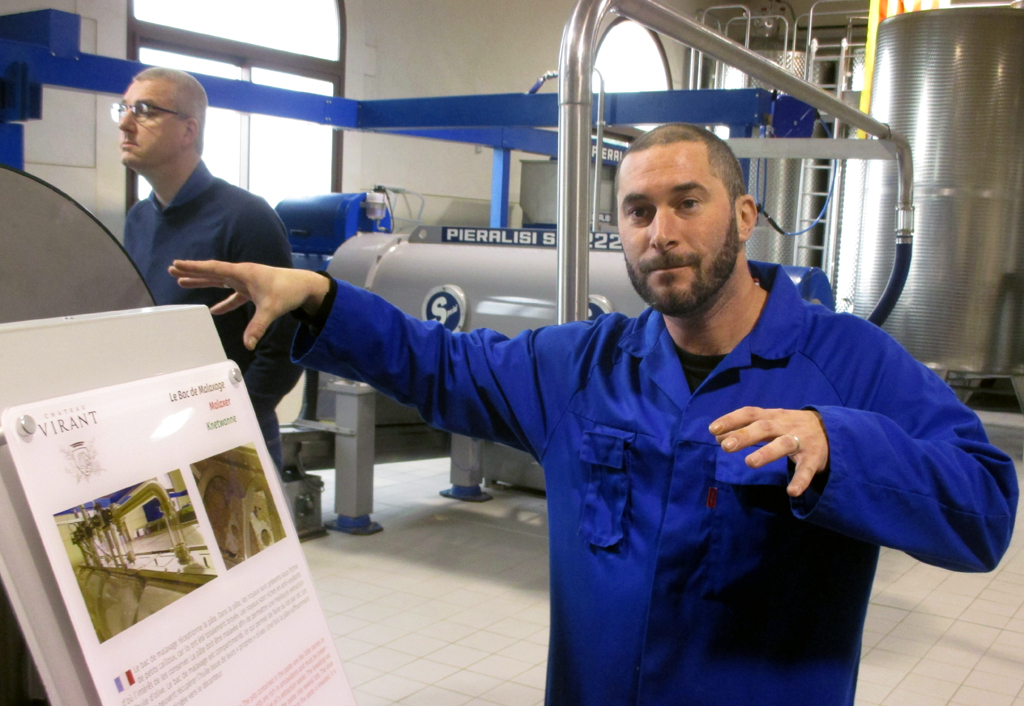 Nach Anlieferung und Aufbewahrung fallen die Oliven in einen Trichter. Ein Förderband transportiert sie zum Entfernen der Blätter. Die Oliven werden gewaschen, getrocknet und im Mahlwerk zerstampft. Die Paste noch mit den Kernen fällt in die Knetwanne. „Die Kerne sind reich an Anti-Oxidantien, die helfen, Zellschäden im Körper zu vermeiden“, betont Aurelien. Ist die Paste genug geknetet, geht es in Dekanter, Zentrifugen, die das Öl von der Schale, den Kernen und dem Wasser trennen, es endgültig von Wasser und noch verbliebenen Schmutzresten befreien. Dann – et voilà! – ist das Öl da! Ein Behälter fängt es auf. Es wird entweder für den Olivenbauer abgefüllt, der die Oliven angeliefert hat, oder in Tanks geleitet. „Wie beim Wein setzen wir da reaktionsträges Gas ein“, sagt Aurelien. Nur so lasse sich eine Oxidation vermeiden und das Aroma des Öls erhalten.