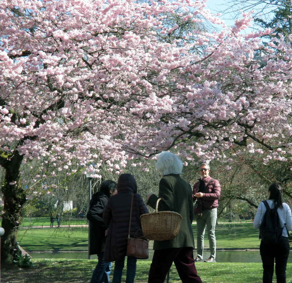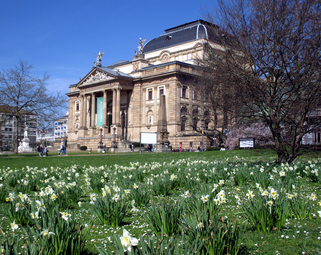 Forsythien blühen. Es ist schön, die ersten Obstbäume zu sehen, wie sie sich entfaltet haben. Am Kurpark in Wiesbaden, hessische Landeshauptstadt und, wenn man so will, östliches Tor zum Rheingau, sind uns vorher schon japanische Touristen aufgefallen, die sich unter rosafarbener Kirschblütenpracht gegenseitig immer wieder selbst fotografiert haben, sich dabei vielleicht sogar zur Kirschbaumblüte ins eigene Land versetzt fühlen.