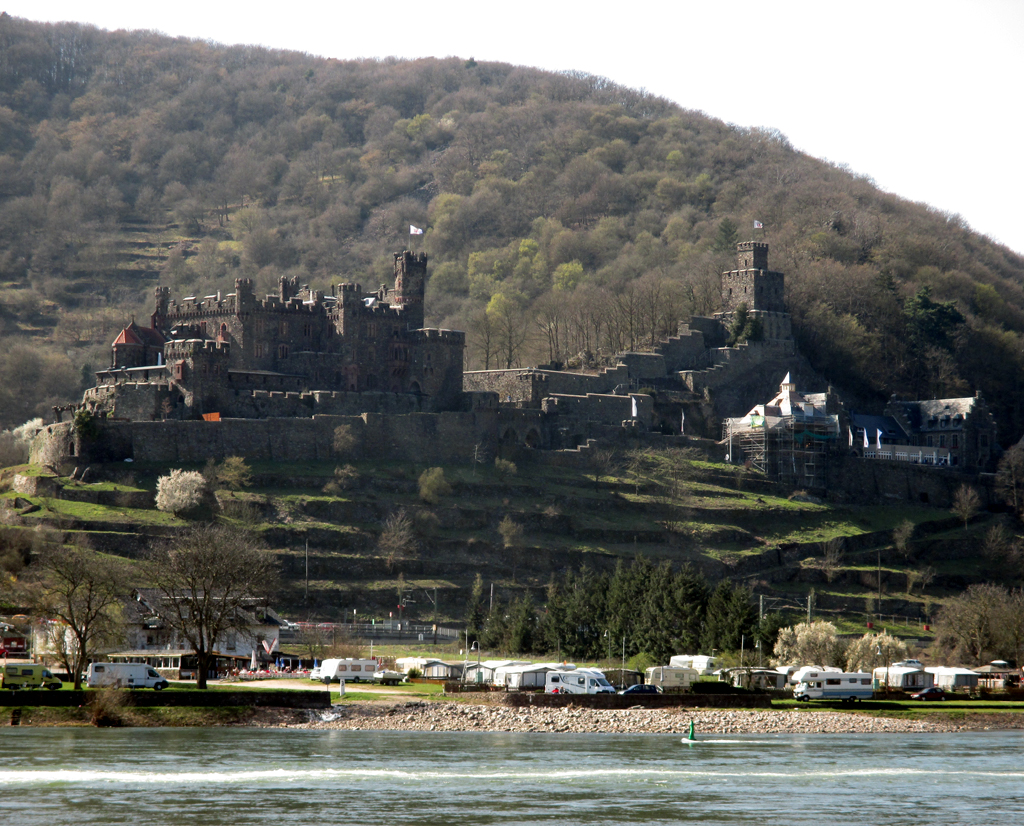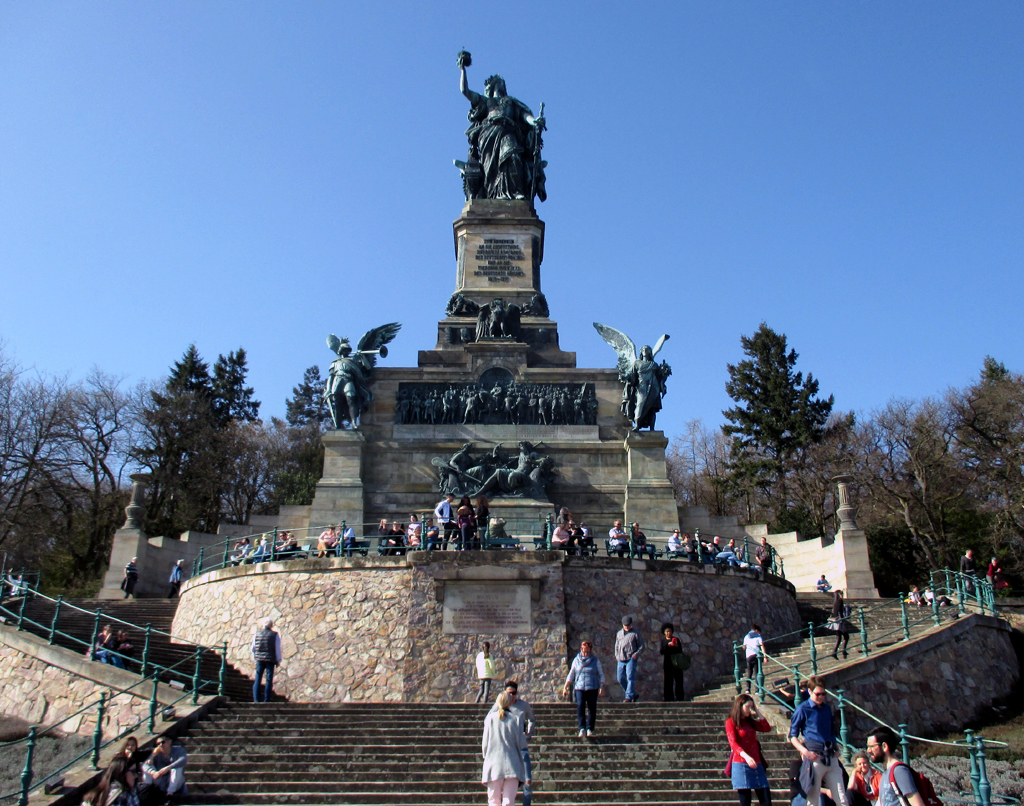 Bei Lorch erreichen wir im Weltkulturerbe Mittleres Rheintal wieder den Rhein. Von Niederheimbach bis Bingen erheben sich gegenüber Burgen wie Heimburg, Sooneck, Reichenstein, Rheinstein und, am Binger Loch kurz hinterm Mäuseturm, Burg Klopp auf ihren Felsen. Diesseits kommt hoch über Rüdesheim in Erinnerung an die Einigung Deutschlands 1871 nach dem Krieg zwischen Deutschen und Franzosen das auch mit Gondeln erreichbare, aus verschiedenen Bronzereliefs bestehende, monumentale Niederwalddenkmal mit Germania an der Spitze hinzu, die, könnte sie singen, wohl die Wacht am Rhein intonieren würde. Sie müsste das Lied gar nicht mal auswendig können, da fünf von insgesamt sechs Strophen gleich unter dem Hauptrelief eingemeißelt sind.