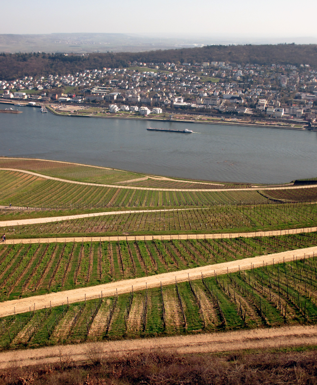 Unten auf dem Rhein fahren kleinere Sportboote und größere Frachtschiffe mit Namen wie Nida oder Caesar vorbei. Am Ufer sind Spaziergänger, Radfahrer und Inliner bemüht, sich nicht gegenseitig in die Quere zu kommen, packen bei einer Rast ihre Picknicksachen am Hebekran von Oestrich-Winkel aus, hinter dessen Bretterverschalung sich eine schon vor 2000 Jahren von den Römern genutzte Technik verbirgt, mit der Schiffe einst ihre begehrte Fracht genau hier an Bord genommen haben, den Riesling! Von dem es übrigens in einem Führer, den der Rüsselsheimer Autobauer Opel einmal für eine Fahrvorstellung durch den Rheingau zusammengestellt hat, heißt, dass er vor 100 Jahren sogar der „teuerste Wein der Welt“ gewesen sein soll. Weder Rothschild Lafite noch Margaux hätten da jedenfalls mithalten können ...