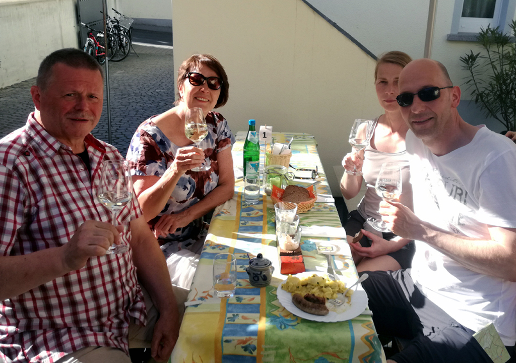 Im Moment, Mitte Mai, haben die Gerhards mit dem Schutz der Pflanzen im Weinberg begonnen. „Besonders bei den Burgunder-Reben mussten doppelte Triebe ausgebrochen werden“, betont Michaela. Was bis Sommer in jedem Fall noch zu erledigen ist, sind die Auslieferungstouren. Für die Gerhards geht es dabei etwa nach München, Hamburg und Dresden. „Das“, so Michaela, „sollte unbedingt abgehakt sein, ehe die Hauptarbeit im Weinberg und auf den Festen beginnt!“