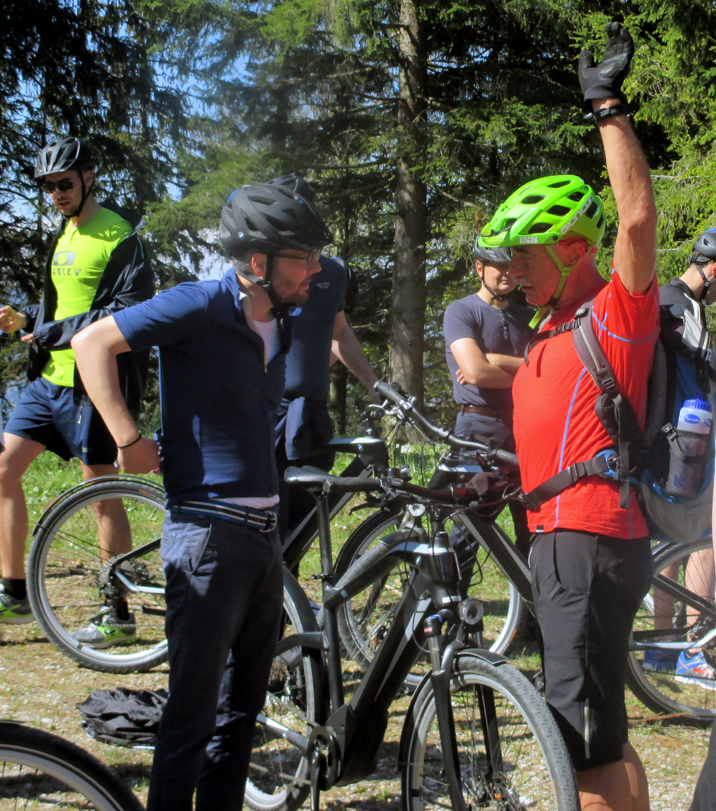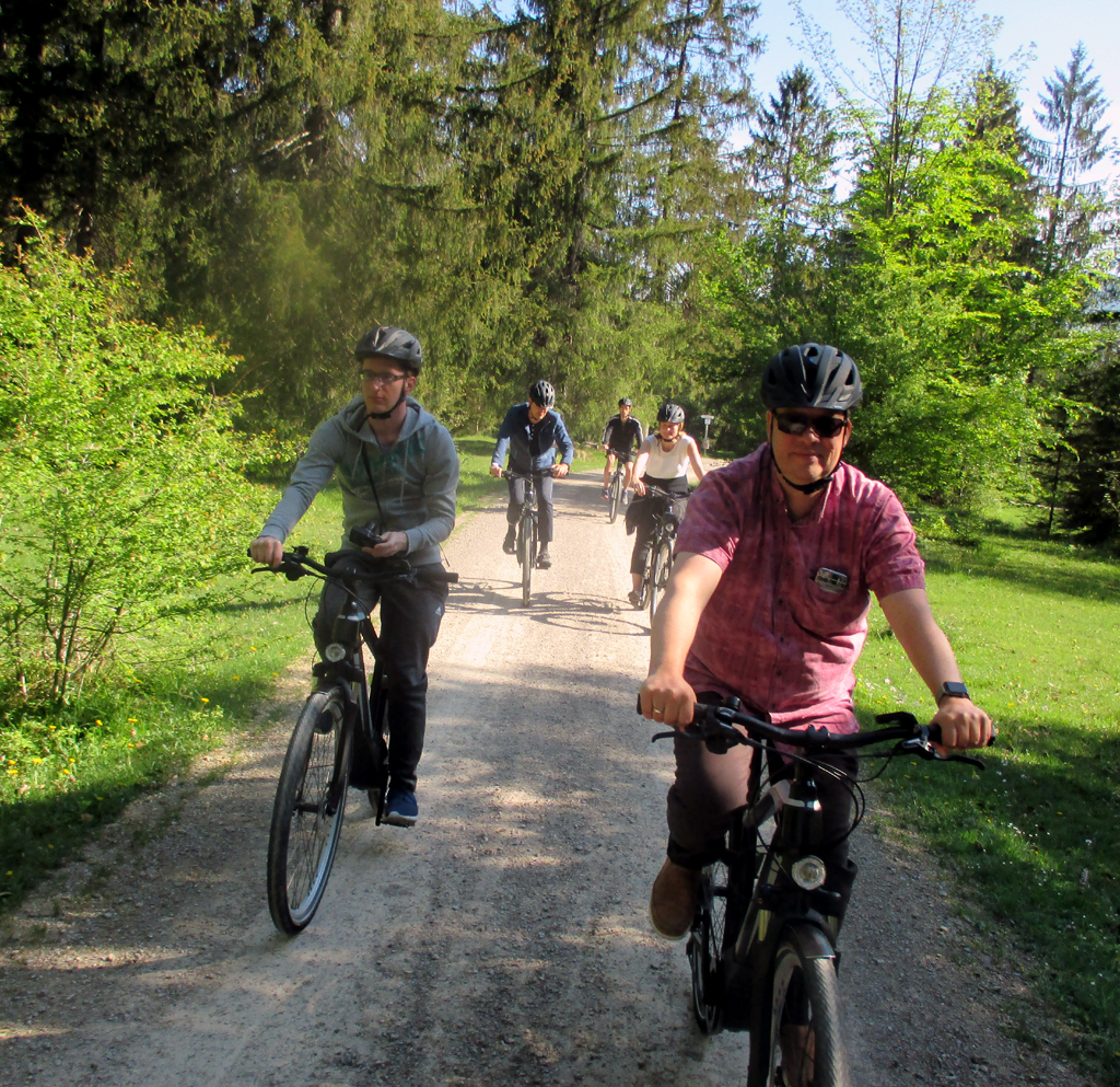Die erste Flachetappe haben wir hinter uns. Die Wohnbebauung ist langsam in frisch-grüne Wiesen mit gelbblühenden Butterblumen und Löwenzahn übergegangen. Auf den schattigen Schotterwegen wird es in Schrittgeschwindigkeit durch den Wald hinauf trotz vorsommerlich-sonniger Temperaturen sonst im Tegernseer Tal kühler, später durch den Fahrtwind beim über Tempo 40 schnellen Hinunterfahren sogar kalt. „Wichtig beim Hochfahren ist, das für einen selbst angenehmste Tempo möglichst konstant zu halten“, rät der Heigl Sepp. Gestrampelt werden muss sowieso. Trotz Unterstützung.