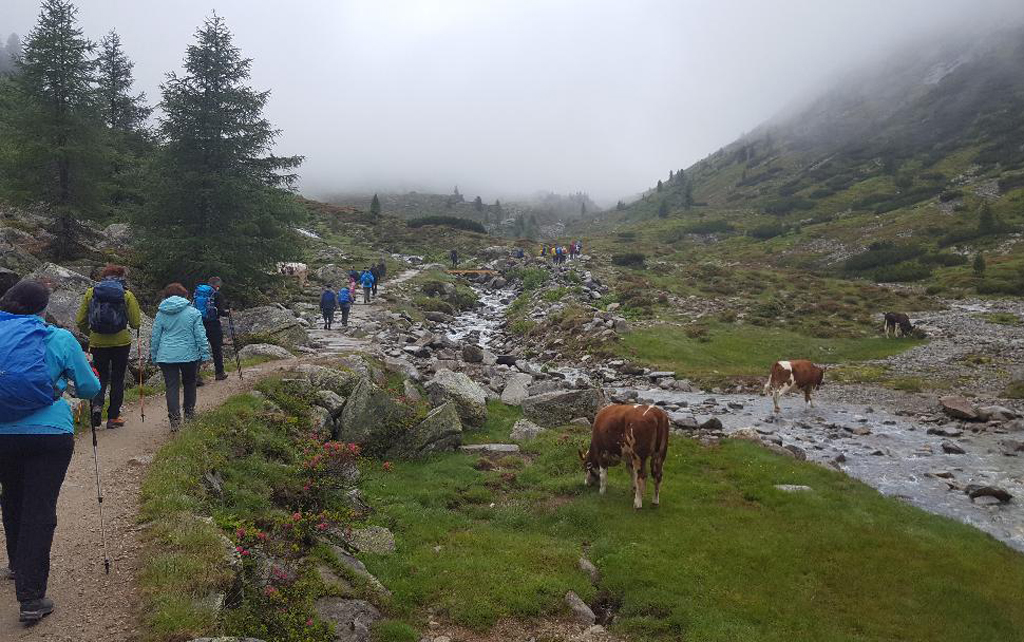Manchmal sind es Salamander, die den Bergwanderern über den Weg laufen, Kühe, die ein oder andere Gams. Auch die Vielfalt der Flora begeistert bei den Auf- und Abstiegen. Während das Tal um Gmund am Tegernsee noch zum Baden in dem malerischen Gewässer animiert, ist es einige Etappen später bei der Überquerung des Alpenkamms schon etwas kühler, so dass sich zweckmäßigere, wärmere Kleidung empfiehlt. Wir übersteigen die Baumgrenze. Die Gastronomie im Pfitscherjoch-Haus auf der italienischen Seite der Zillertaler Alpen in 2275 Metern Höhe zieht alle Register. Immerhin sind knapp 1500 Höhenmeter überwunden, die dann in Südtirol im Norden Italiens seicht bergab führen und im malerischen Sterzing enden.