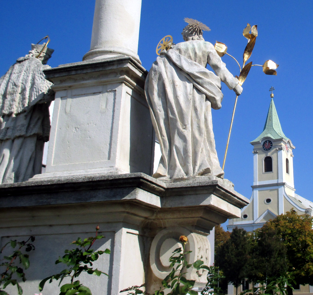 Weiden, die kleine Weinbaugemeinde am nordöstlichen Ufer, döst in der späten Vormittagssonne vor sich hin. In dem 2400-Seelen-Ort, durch den der von Frauenkirchen nach Haslau führende Jakobsweg Burgenland verläuft, geht es inzwischen wieder etwas beschaulicher zu. Die Trauben sind gelesen. „Jetzt können wir einen Gang zurückschalten“, sagt ein Weinbauer, mit dem wir an der Dreifaltigkeitssäule am Markt in Sichtweite der Pfarrkirche darüber kurz ins Gespräch kommen. Es könne ein sehr guter Jahrgang werden, hofft der Winzer. „Die Sonne hat in diesem Jahr auch bei uns doch sehr viel Kraft gehabt!“
