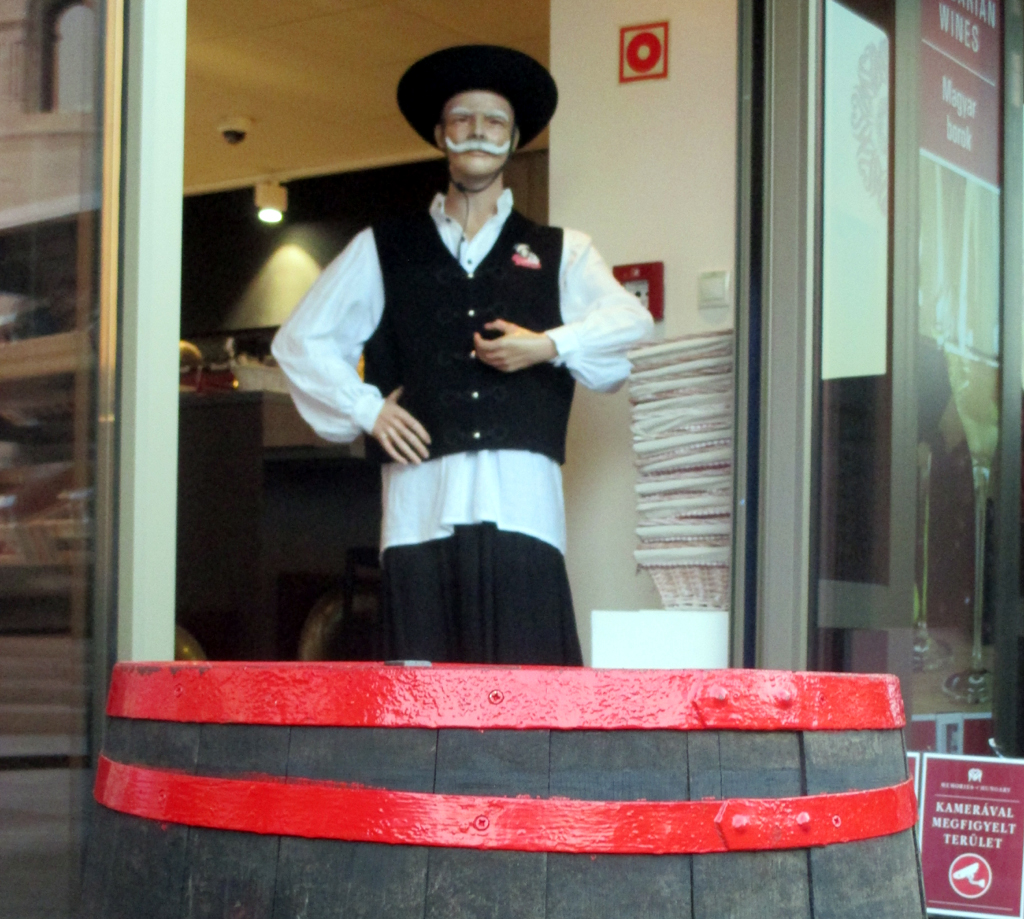 Ungarn, bekannt für Tokajer, ist auch Weinland. Türsteher in Tracht in einem Souvenirladen.