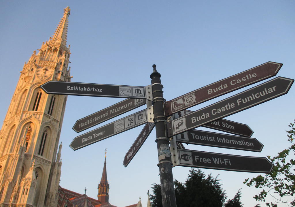 Budapest hat viele Ansichten zu bieten. Die Hinweistafeln neben der Matthiaskirche helfen.