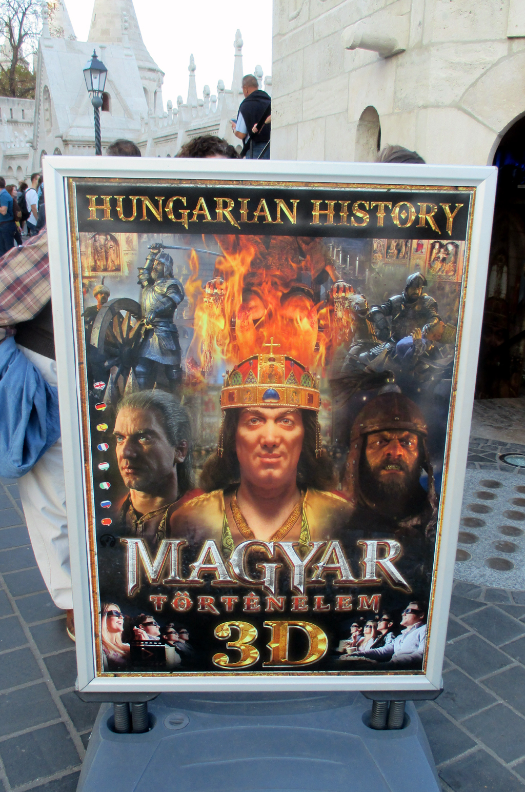 Hinweisplakat auf ungarische Geschichte im 3D-Format. Figurengruppe in einer Basteimauer.