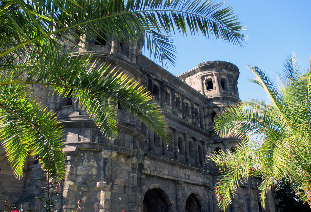 Ein Frachtschiff bei Trier auf der Mosel. Palmen verbreiten vor der Porta Nigra südliches Flair.