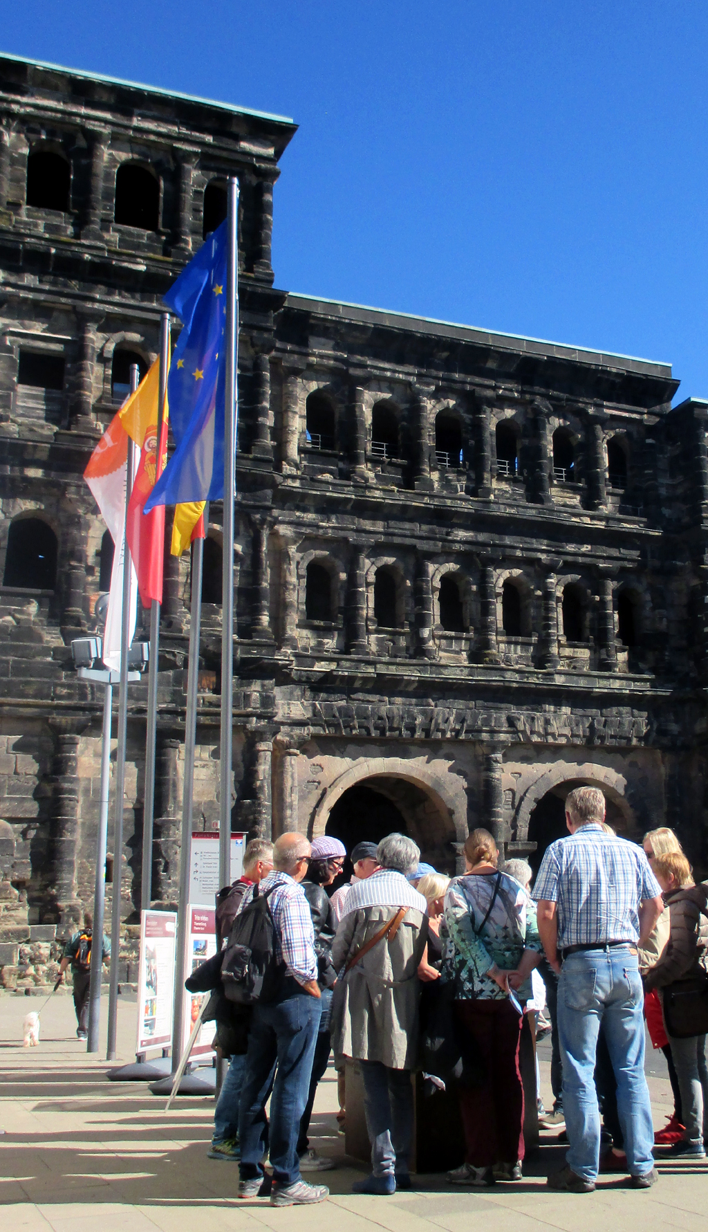 Ein ganz normaler Donnerstag Ende September. Die Mosel fließt in der Mittagssonne langsam dahin. Weiße Ausflugsschiffe legen an. Kleinere Frachtschiffe fahren vorbei. Der Wasserstand, das ist von der Brücke aus mit bloßem Auge zu sehen, war auch schon mal höher. Die runde Hubschrauber-Start- und Landefläche auf Stelzen hoch oben über dem Krankenhaus der Barmherzigen Brüder an der Nordallee scheint verwaist. Gott sei Dank, denn das bedeutet, dass zumindest im Moment offenbar kein akuter medizinischer Notfall aus der Luft zu versorgen ist. In Sichtweite schräg gegenüber treffen immer mehr Touristen ein. Die Südstaaten-Amerikanerin Lindsey aus Huntsville/Alabama wundert sich: „Oh, look at that“, sagt sie zu Burt, ihrem Mann, der einst als GI in Deutschland stationiert war, „it’s really black!“ Natürlich sei es schwarz, gibt der übersetzt zurück. Es heiße schließlich Porta Nigra, lateinisch für schwarzes Tor.