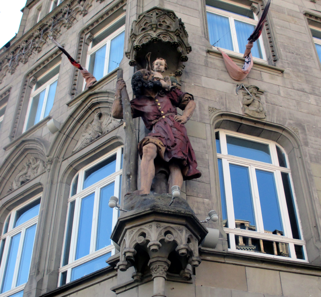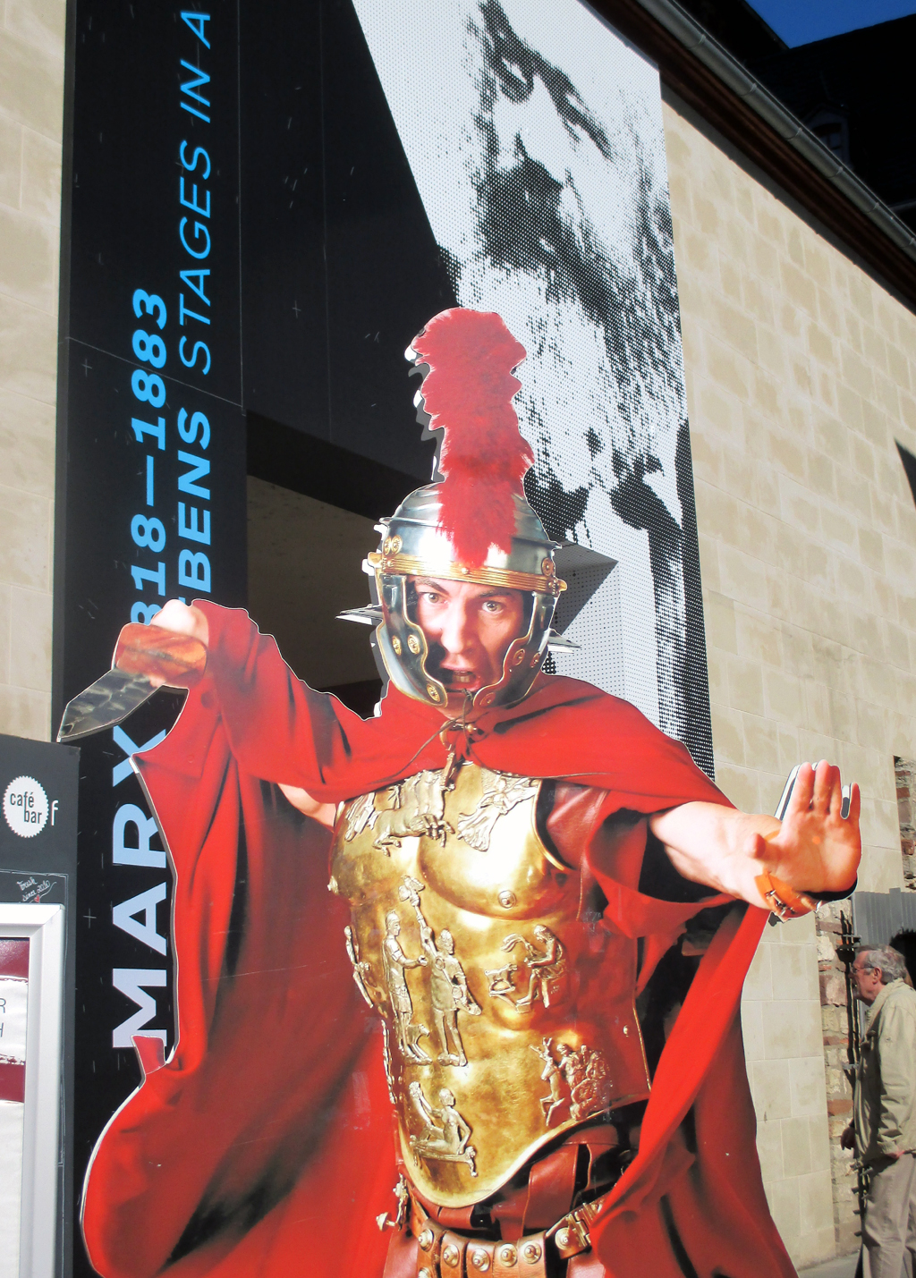 Römerhelm neben Römerkopf und römischer Krieger als Aufstellfigur bei der Porta Nigra.