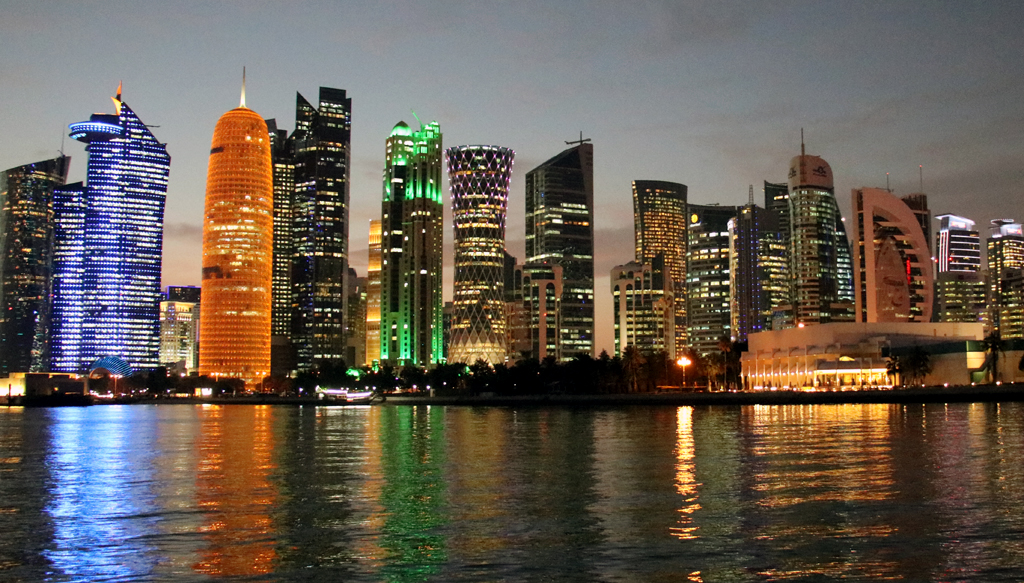 Schillernde Kulisse: Silhouette der Millionenstadt Doha. Sand, Erdgas und Erdöl sorgen für den Wohlstand in Qatar.
