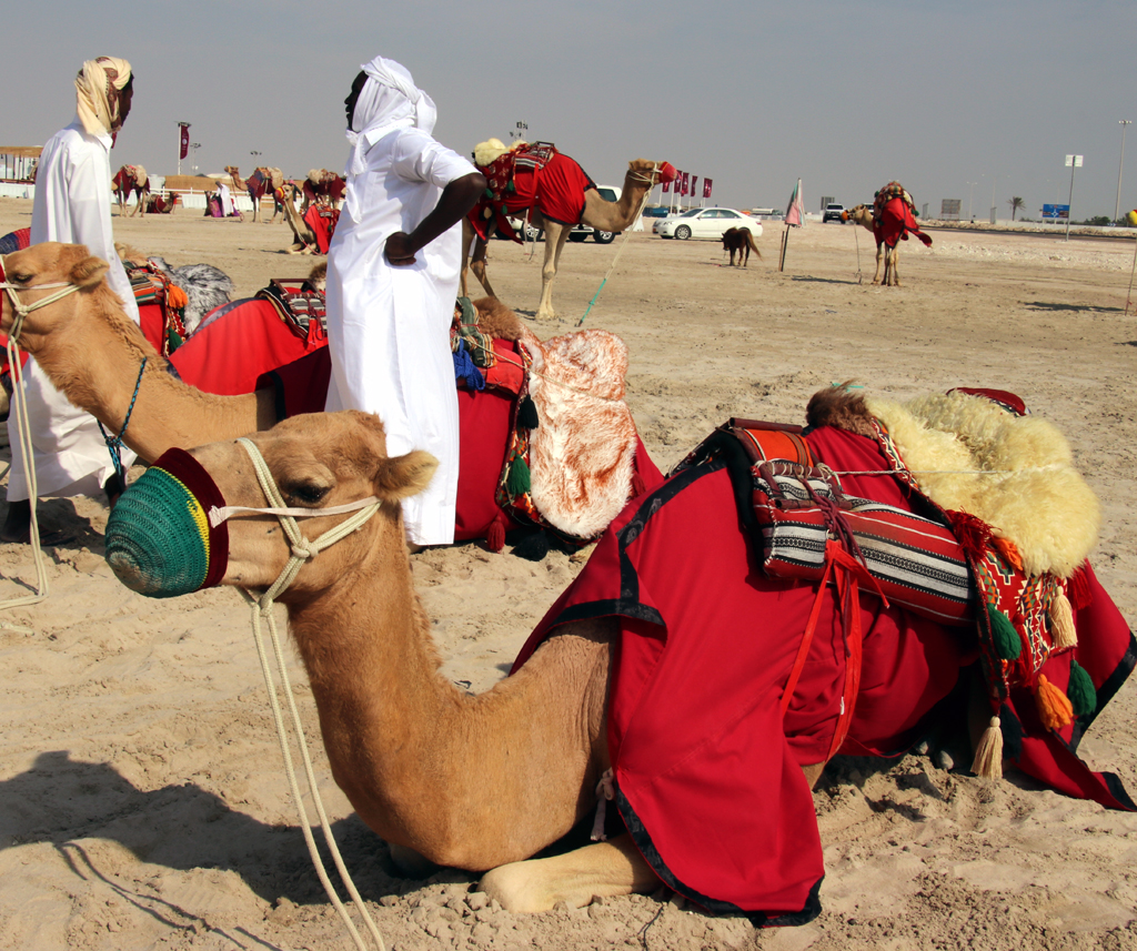 Das Museum für Islamische Kunst liegt auf einer künstlichen Insel. Diese Kamele sind für touristische Ausritte da.
