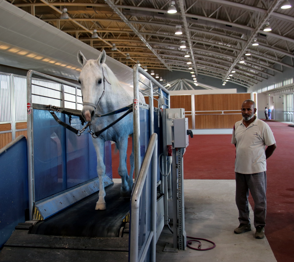 Saad Ismail Al Jassi war früher sogar auch einmal Bodybuilder. Pferd auf einem Laufband im Gestüt Al Shabab.