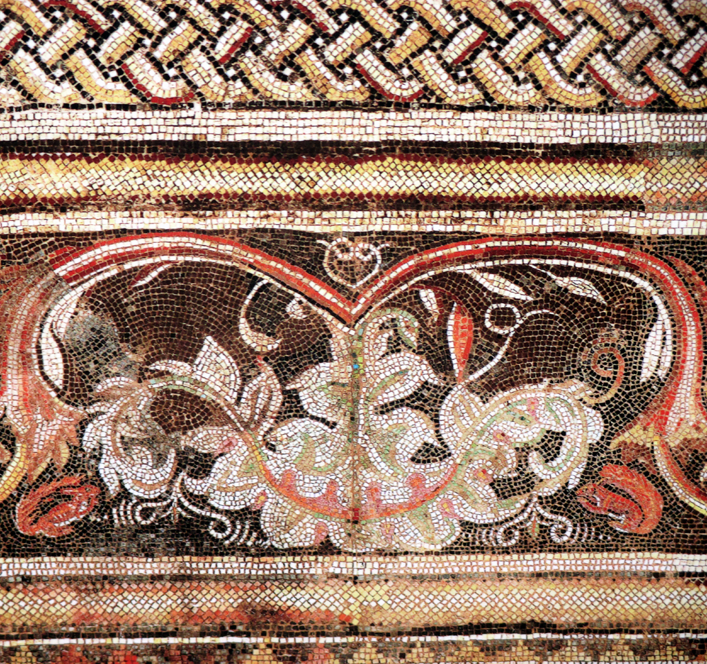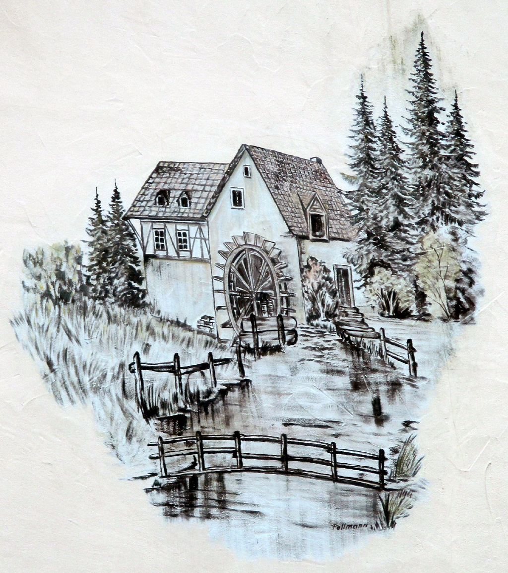 Das Mühlenmotiv links ziert eine Hausfassade. Das Mosaik rechts stammt aus der römischen Villa Otrang bei ...