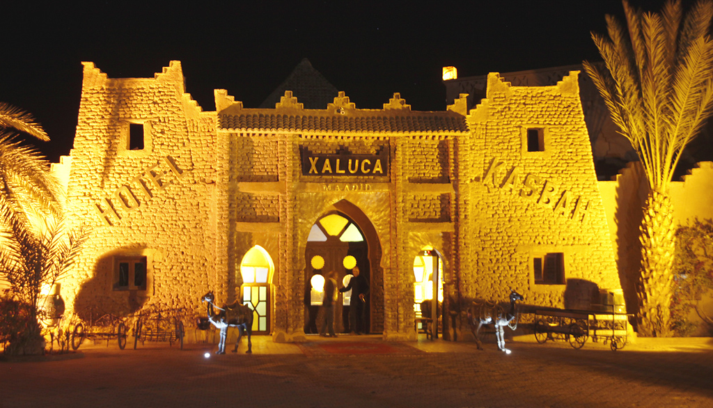 Los geht’s! Frankfurt-Barcelona. ACE-Charterflug 0010 steht in Barcelona für den Weiterflug bereit. Zwei Stunden. 1000 Kilometer. Landung in Er-Rachidia. Das Abenteuer beginnt! Es ist schon spät am Nachmittag. Wir fahren nach Arfoud. Das Tor zur Wüste im Osten von Marokko am Rand der Sahara zu Füßen des 935 Meter hohen Jbel Arfoud. 30 000 Einwohner. Von den Franzosen einst wegen der Nähe zu Algerien an strategisch wichtiger Stelle als Garnison errichtet. Die Straßen rechtwinklig angeordnet. Drehort für Filme wie „Marschier‘ oder stirb“, „Die Mumie“ oder den James-Bond-Streifen „Spectre“. Die Gegend Fundstätte bedeutender Fossilien. Die berühmten Sanddünen von Merzouga sind nicht weit. Wir quartieren uns in Arfoud im Kasbah-Hotel Xaluca ein.