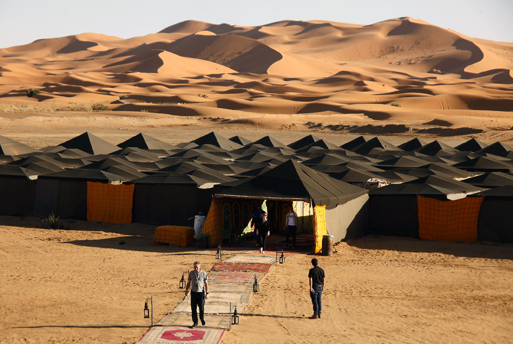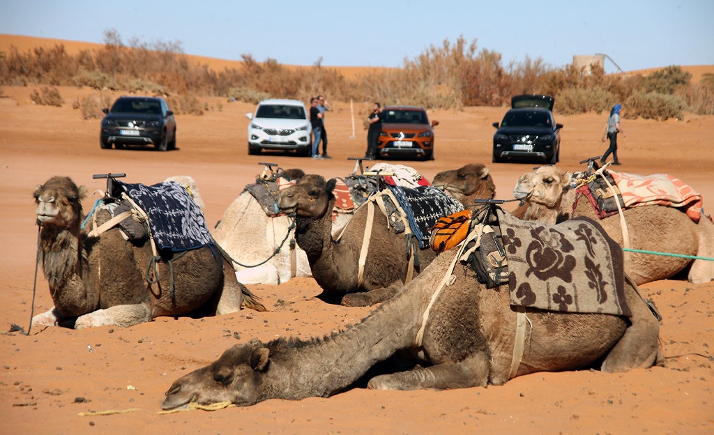 Am nächsten Morgen. Eine Stunde Fahrt Richtung algerischer Grenze. Keine befestigten Straßen. Offenes Gelände. Der Flugsand macht zu schaffen. Kinder bieten „Fossilien“ zum Kauf an. Schwieriges Terrain. Teilweise geht es an steilen Abhängen entlang. Gut, dass der Tarraco Allrad und verschiedene Einstellmöglichkeiten hat, was die Beschaffenheit des Untergrunds betrifft, er sogar bei extremeren Bedingungen noch Sicherheit beim Fahren vermittelten kann! Die nächste Etappe. Fast nur Sand. Vom Tarraco-Wüstencamp nach Er-Rissani. 20 000 Einwohner. Großes Stadttor. Geradlinige Straßen. Hellrot angestrichene Häuser. Täglicher Markt – mit großflächigem Parkplatz für Esel! Die Ruinen von Sidschilmasa, früher wichtige Karawanenstadt, sowie traditionelle Stampflehm-Siedlungen und Berber-Speicherburgen in der Nähe. Wir steigen von 190 Pferde- auf wogende Kamelstärken um. Blick von einer Düne in den Sonnenuntergang. Noch immer 20 Grad. Wer möchte hier jetzt noch weg? Es wird dunkel. Wir ziehen weiter. Abwärts. Zum Haimas-Village-Camp nahe Merzouga. Abendessen. Übernachtung im Zelt.