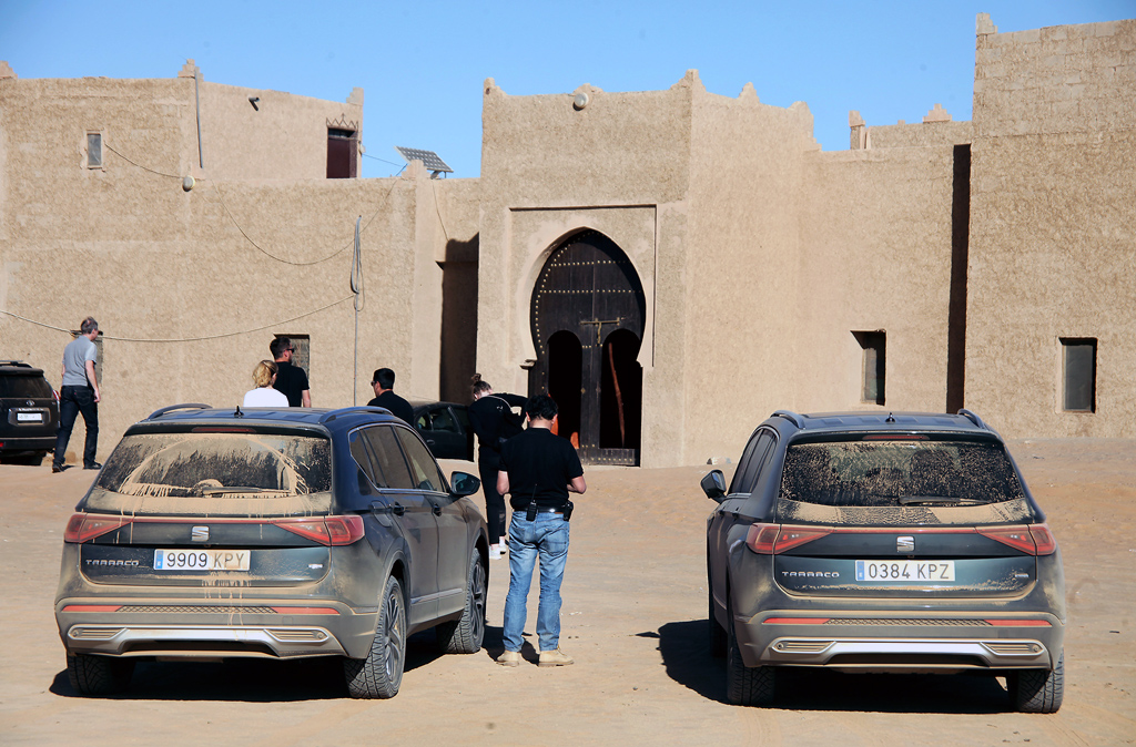 Mit orientalischem Flair: Kasbah-Hotel Xaluca in Arfoud. Seat-SUV Tarraco in der Wüste.