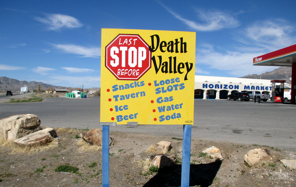 Pahrump, abgeleitet vom indianischen Pah-Rimpi-Rimpi für „Wasserfelsen“, ist eine Kleinstadt an der Grenze zwischen Nevada und Kalifornien. Die ersten Siedler in der Gegend sind Shoshonen. Die Rancher danach bauen Luzerne und Baumwolle an, halten Vieh. Heute scheint der Ort zumindest den Schildern nach bekannt vor allem für Casinos wie das Nugget, für legale Prostitution und Bordelle zu sein. Der Highway, so steht es am Straßenrand, ist den Veteranen der Vereinigten Staaten gewidmet. Kurz danach schon die Abbiegung zum Ash Meadows Wildlife Refuge – und ins Death Valley. Im Hintergrund die Funeral Mountains. „Das passt“, findet der Kollege, der mit uns fährt. Funeral heißt immerhin Beerdigung. Eine Tankstelle noch und ein Supermarkt. Letzter Stopp vorm Todestal. Wer sich nicht ganz sicher ist, deckt sich lieber schnell noch mit Sprit, Snacks, Eis und Getränken ein.