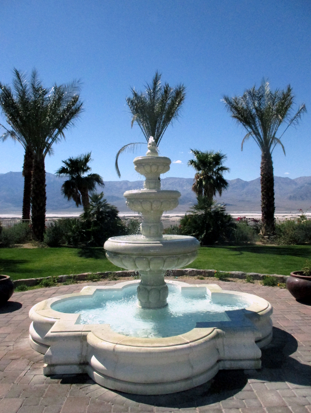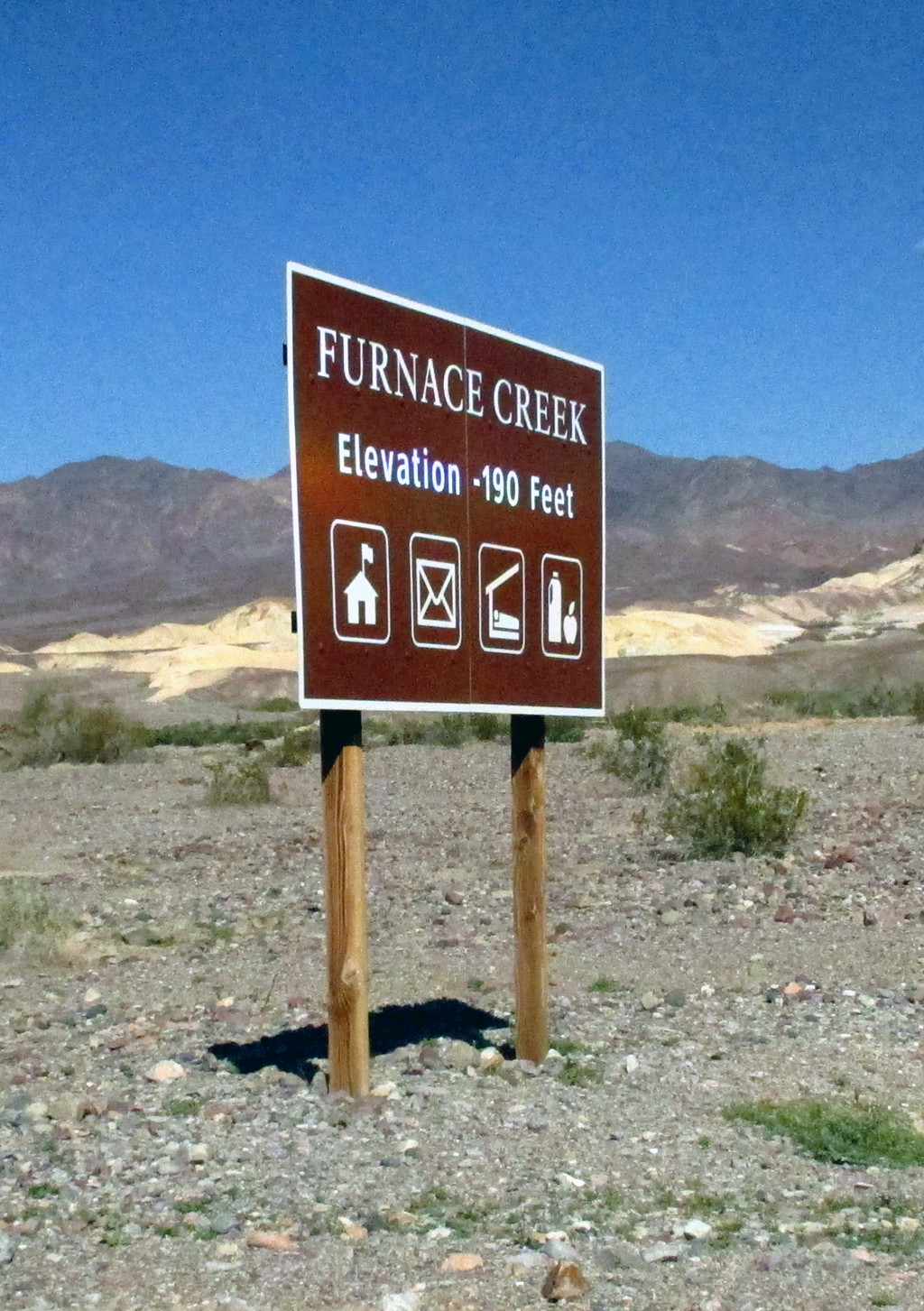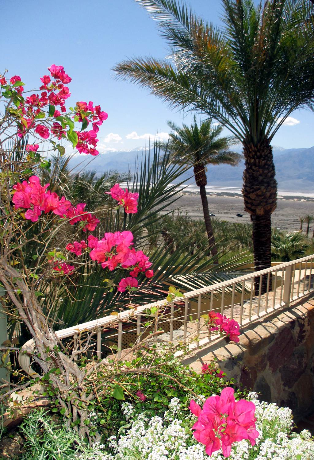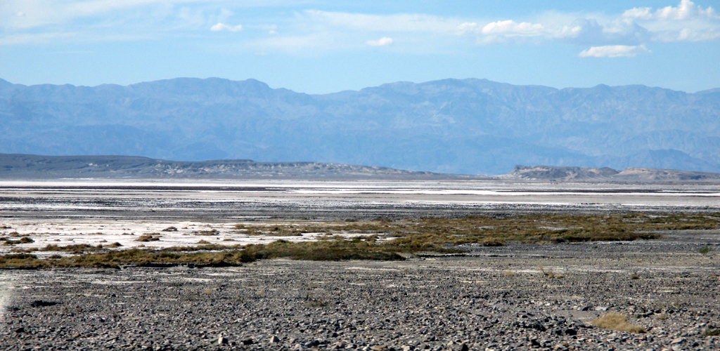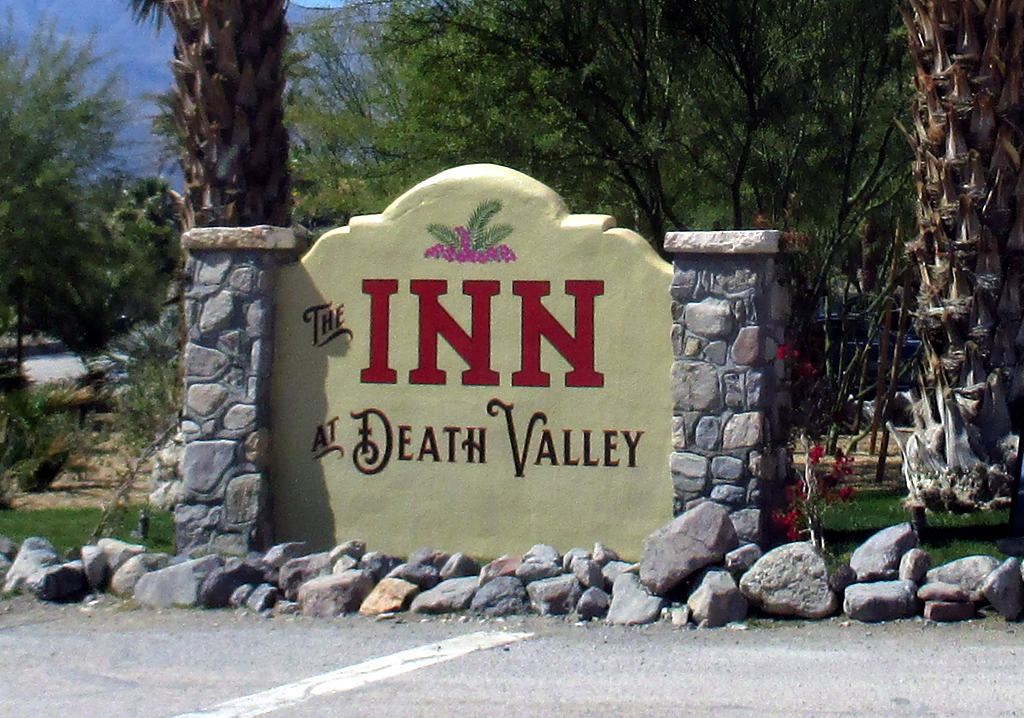 Noch befinden wir uns auf einer Höhe von über 600 Metern. Aber das ändert sich bald. Die Gegend wird unwirtlicher. Kaum Menschen. Selten Autos. Endlos lange Straßen, bisweilen Kilometer um Kilometer nur geradeaus. Eine nicht selten aus Kakteen bestehende Vegetation, die immer spärlicher wird. Geröll. Bizarre, von Wind und Wetter geschliffene Felsen, die einer Mondlandschaft gleichen. Wir erreichen die Mojave-Wüste, in der das Tal des Todes liegt. Der trockenste Nationalpark in den USA, südöstlich der Sierra Nevada gelegen. Nach 30 Kilometern erreichen wir Furnace Creek, zuletzt offiziell 24 Einwohner. Lunch im Death Valley Inn. Natürlich mit Burger, Pommes, Ketchup und Getränken voller Eis – unter Palmen in mediterrane Architektur in einem unter anderem von der Bergkette der Panamint Range mit dem 3366 Meter hohen Telescope Peak gesäumten Tal, dessen tiefster Punkt – damit auch der der USA – am Badwater Basin mit 85,5 Metern unter dem Meeresspiegel angegeben wird, wo ein ausgetrockneter, ehemals bis zu 200 Meter tiefer See eine flache Salzpfanne hat entstehen lassen.