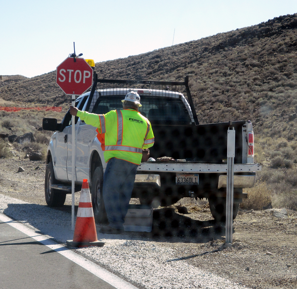 Die Straßen können schnurgerade und endlos lang sein. Das rechts ist keine Panne, sondern nur die Streckenkontrolle.