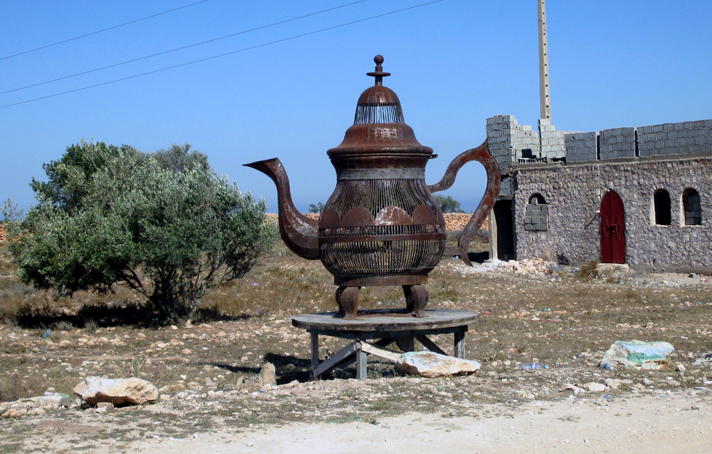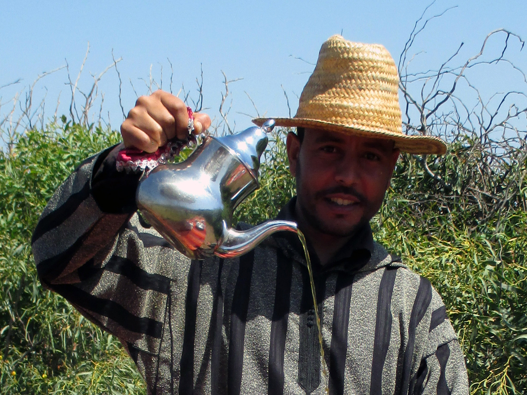 Vom Flughafen fahren wir erst einmal weg von Essaouria, folgen der Beschilderung in Richtung des etwa 175 Kilometer südlichen gelegenen Agadir, biegen jedoch weit vorher, etwa in Höhe von Sidi Ahmed Essayeh, ab, kommen immer wieder durch kleinere Ansiedlungen, in denen wir aufpassen müssen, dass uns Kinder, Esel, Ziegen oder Schafe nicht ins Auto laufen. Über felsigen Boden erreichen wir eine ausgedehnte Dünen- und Strandlandschaft, in der Akazien und Wachholder Mensch und Tier vor zu heftigem Wind und aufgewehtem Sand schützen, legen in einem Camp hinter einer Düne fast direkt am Strand einen Zwischenstopp ein. In den Zelten sind Teppiche ausgelegt und farbenfrohe Sitzkissen verteilt. Es gibt süßen Minztee. Draußen führt ein Marokkaner mit blauem Berberturban und weißem Gewand seine Kamele vor.