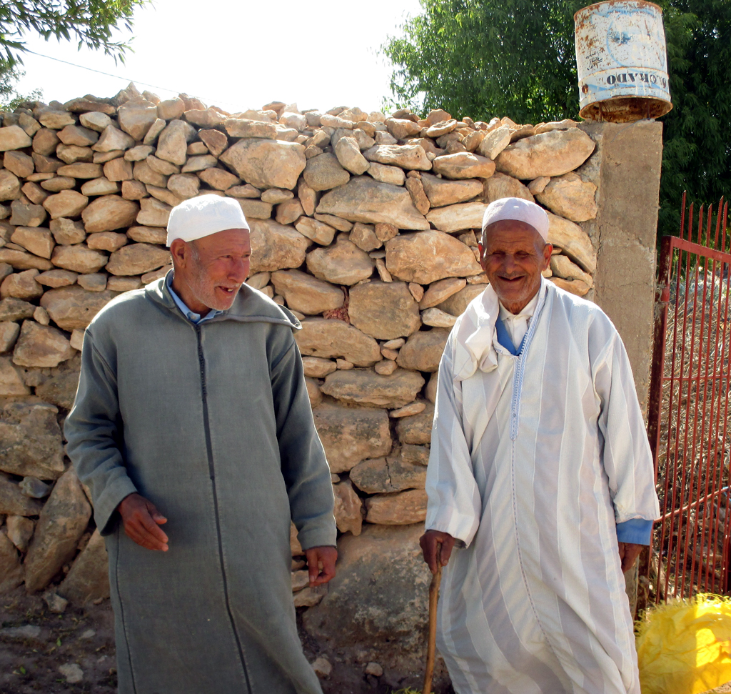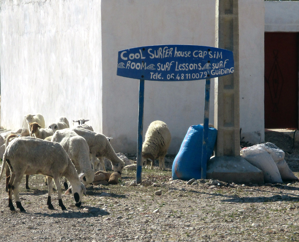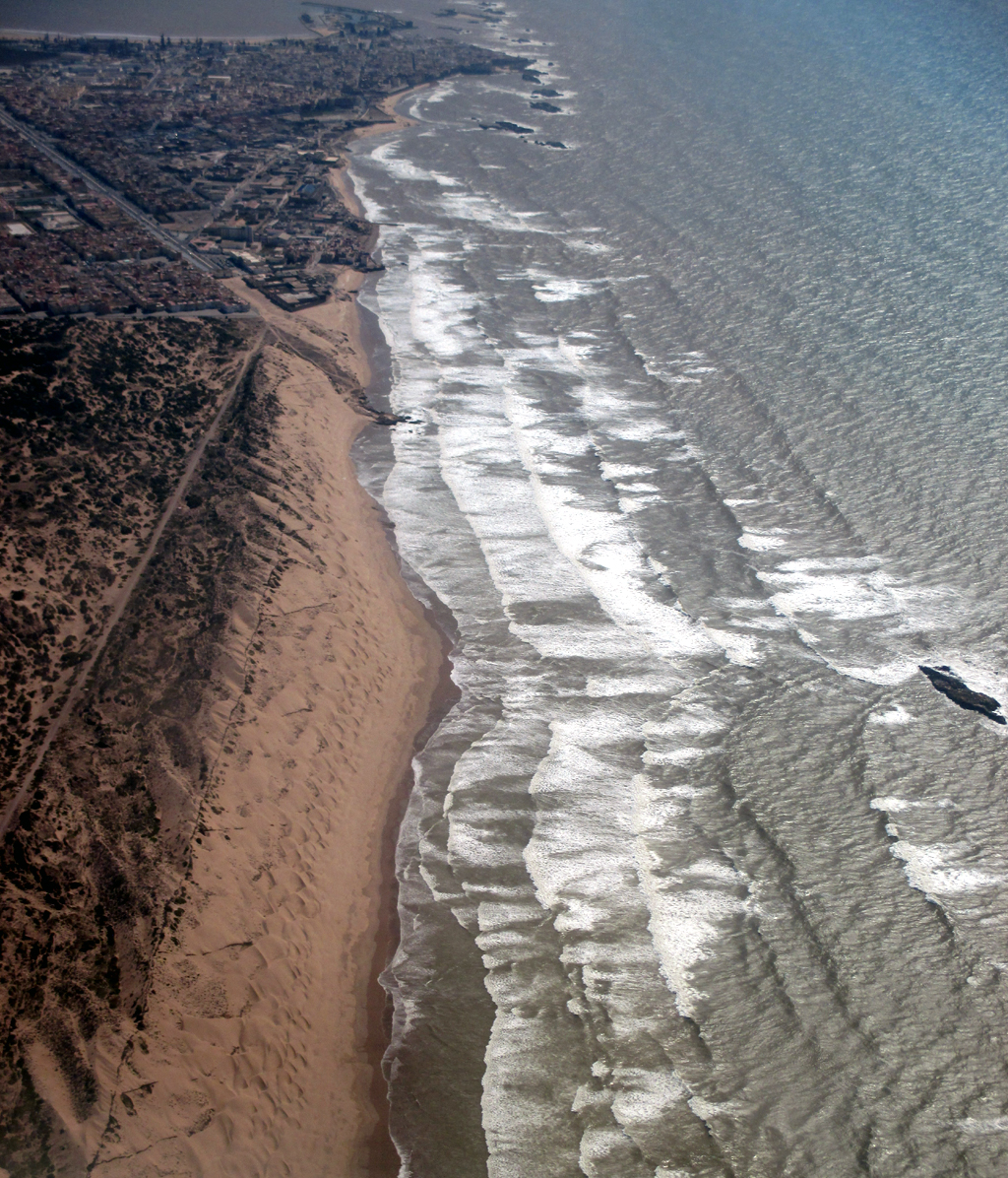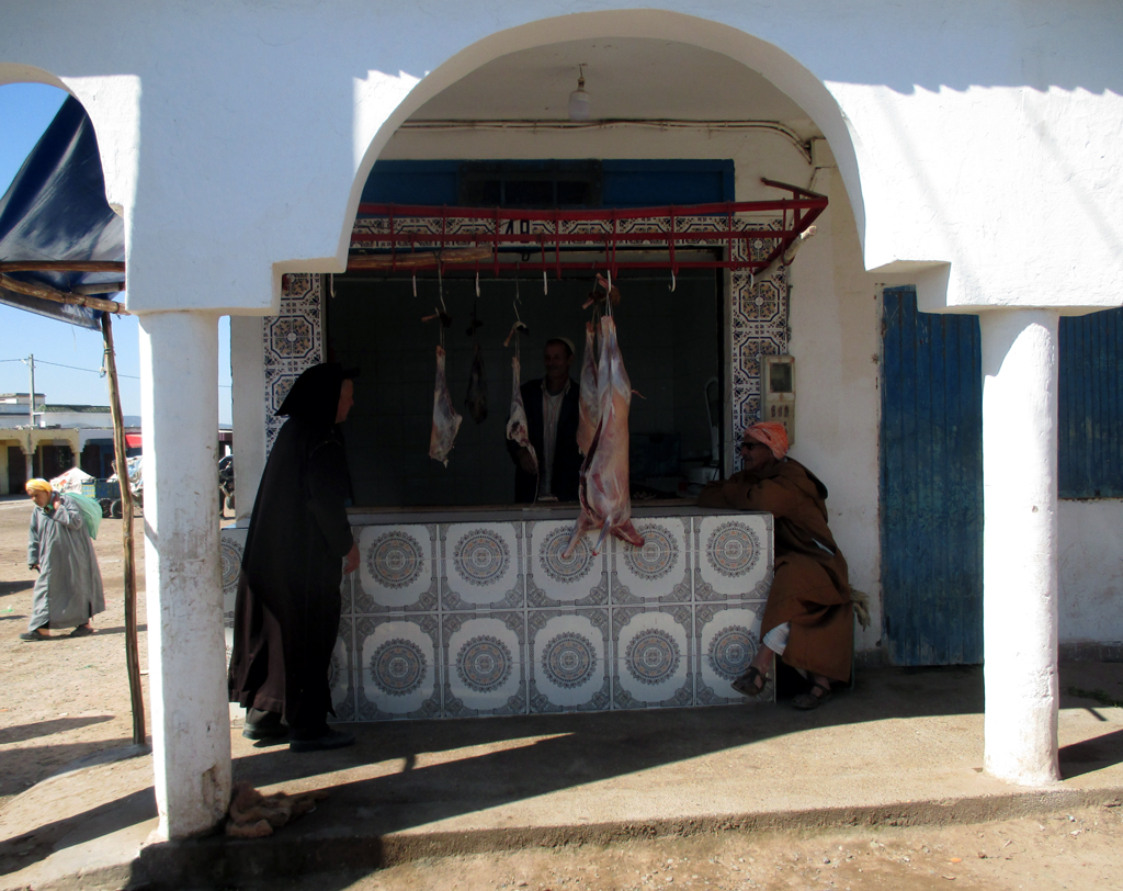 Die Strecke über die landschaftlich schöne Küstenstraße Richtung Norden, wohin wir tags darauf fahren, zieht sich mit fast 370 Kilometern an Saif und El Jadida vorbei bis Casablanca deutlich länger als die südlich nach Agadir. Ziemlich grün ist das Gebiet, das wir am Vormittag erst etwas abseits der Küste durch struppige Wälder nach Norden bis Moulay Bouzarqtoune durchqueren. In einem geschäftigen kleinen Ort verladen Arbeiter palettenweise angelieferte Säcke auf ihre Karren. In einer Werkstatt schrauben Mechaniker in fleckigen Blaumännern an einem alten Peugeot herum. Gehäutete Ziegen und Schafe hängen ohne jedwede Kühlung im Freien am Haken. Wieder auf dem Land fragen wir zwei an einer staubigen Schotterpiste im Schatten sitzende alte Männer in langen Gewändern, ob wir sie fotografieren dürfen; sie lachen und willigen ein. Ein Junge will eine Schildkröte verkaufen. Frauen in wollenen Haik-Tüchern balancieren geschickt Brennholzbündel auf dem Kopf nach Hause. Am felsigen Strandabschnitt bei Zaouia Akermoud, nicht weit vom kleinen Strandhotel und -lokal The Bubble treibt ein Bauer sein beladenes Kamel vor sich her. Ein Hirte hat alle Mühe, seine aus Schafen und Ziegen bestehende Herde zusammenzuhalten. Fischer sind gerade dabei, ihre hölzernen Boote auszubessern.