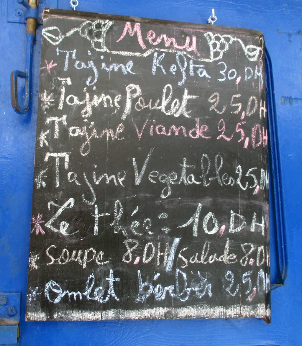 Das Angebot auf dem Basar der Vielfalt ist groß und bunt. Speisekarte auf einer Schiefertafel in einer ausgehängten Tür.