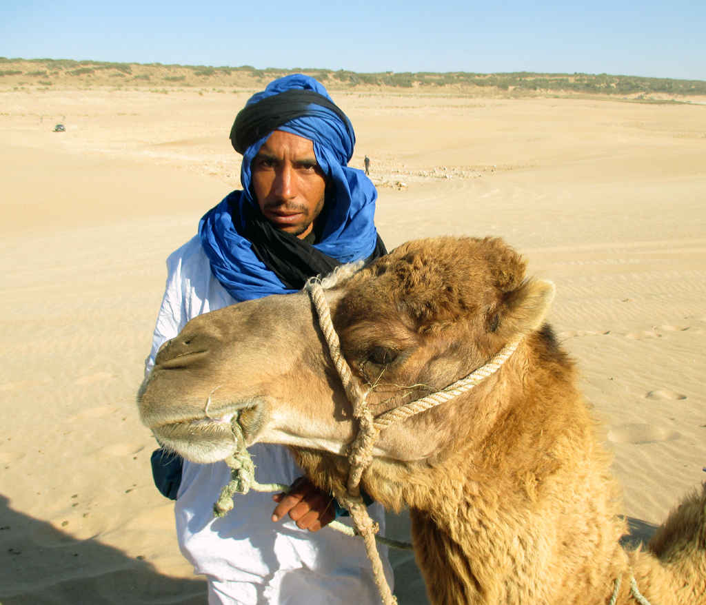 Vorn noch steiniger Untergrund, hinten schon das Meer - und ein Kamelführer mit blauem Berberturban an der Küste.