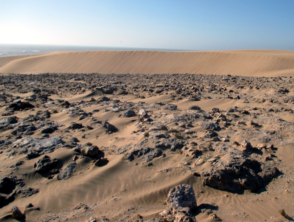 Die zunächst mit Felsen durchsetzte Sandwüste geht in Dünen über. Gleich dahinter kommen Strand und Meer.
