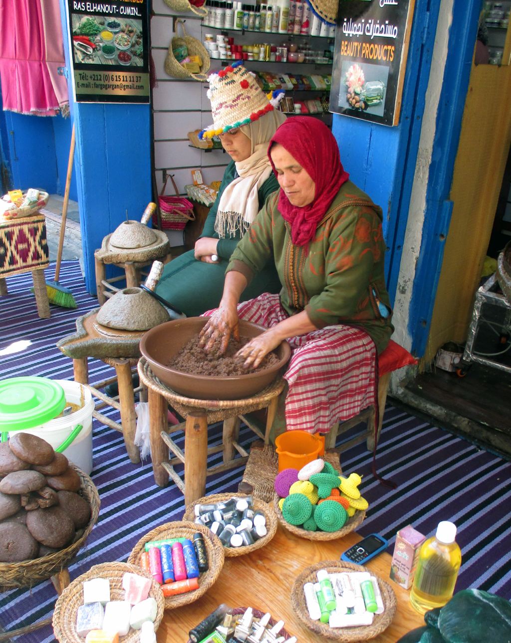 Verschleierte Frauen in weiten Umhängen gehen vorbei. Männer in knöchellangen weißen Djellabas mit orientalischem Filz-Tarbusch auf dem Kopf stehen bei einem Plausch zusammen. Jugendliche schlendern westlich gekleidet daher. Auf dem Basar der Vielfalt scheint es auch in Essaouira von Babysachen über Gemüse, Getränke, Gewürze, Handys, Kartoffeln, Kleidung, Metallkunsthandwerk, Obst, Postkarten und Holzschnitzereien bis hin selbst zu modernen Koffertrolleys nichts zu geben, was es nicht gibt. In runden, aus Lehm gebrannten, mit gewölbten oder spitzen Deckel versehenen Schmorgefäßen, den landestypischen Tajinen, werden gekochte Gerichte angeboten. Zwei bunt bekleidete Frauen sind, vor einem Laden sitzend, gerade dabei, von Hand Marokkos Gold herzustellen: Arganöl.