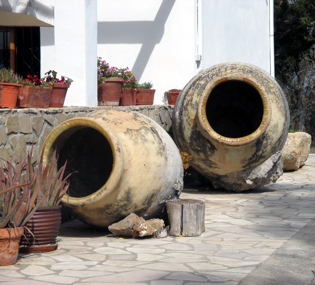 Es gibt Restaurants in der Gegend, die machen draußen mit riesigen Tongefäßen, früher teilweise wohl auch zum Aufheben der Vorräte gedacht, auf sich aufmerksam. Ein Stück weiter steht ein Haus, das zweifellos schon bessere Tage erlebt haben dürfte. Dabei ist die Lage gar nicht so schlecht mit einem kleinen Teich davor und Olivenbäumen dahinter.
