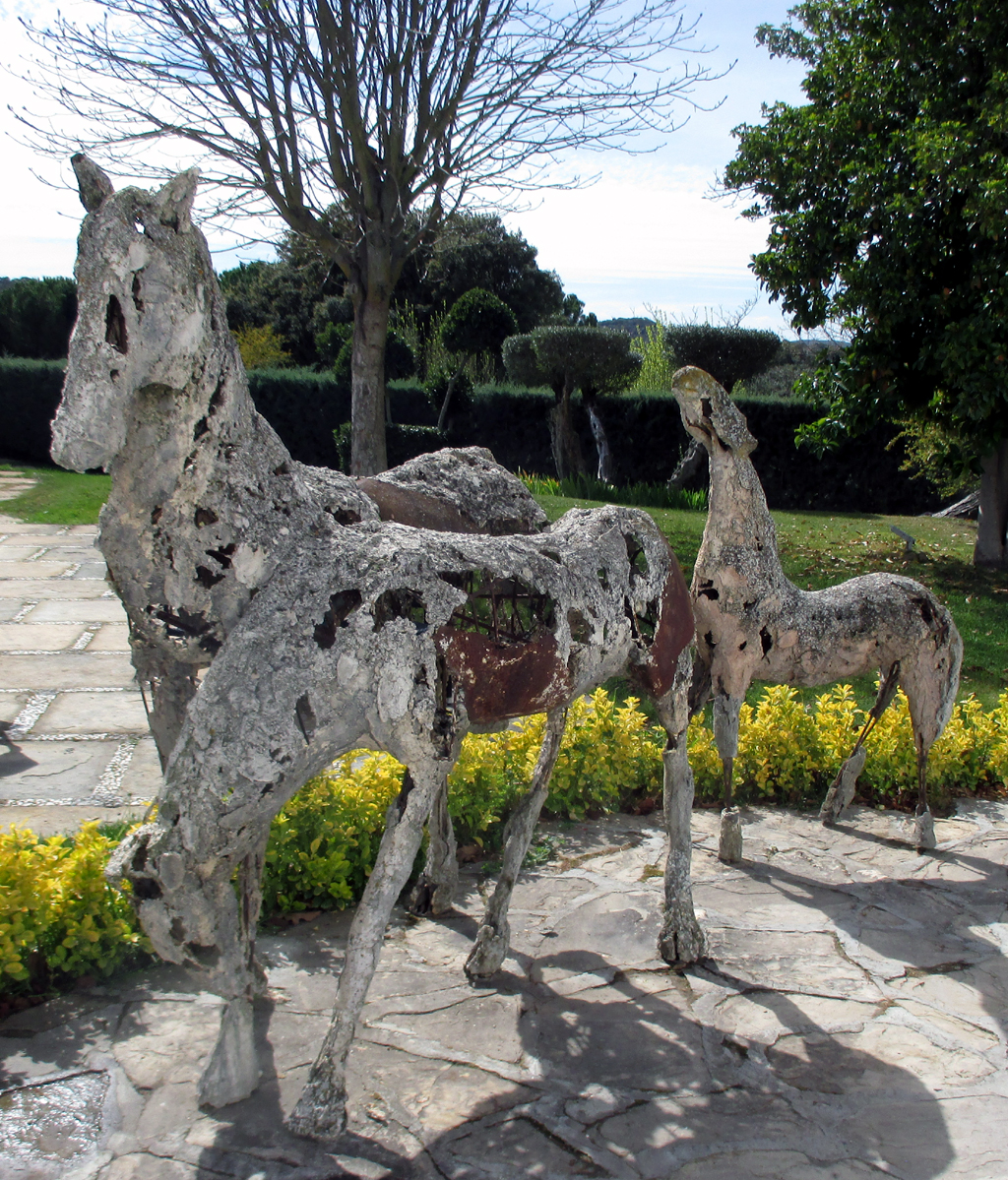 Eine künstlerische Pferdegruppe empfängt Gäste in der Finca La Bobadilla bei Kilometer 65,5 an der Straße von Salinas nach Villanueva de Tapia. Der weiße Gebäudekomplex im maurischen Stil liegt inmitten andalusischer Landschaft zwischen Costa del Sol und Granada, nicht weit von der Kirche Santuario de la Virgen de Gracia und von Loja entfernt.