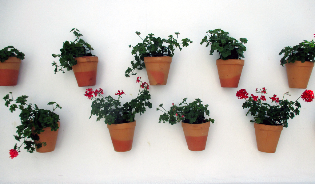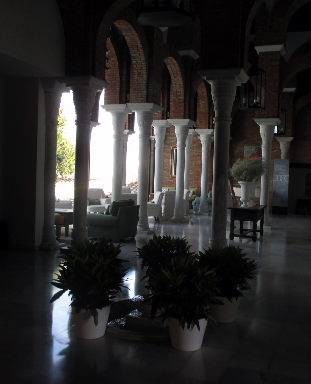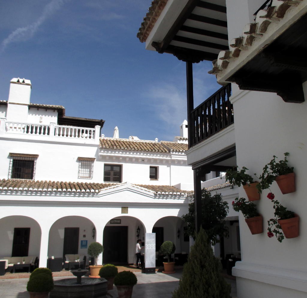 An der weißen Wand des Hauptgebäudes der Finca sorgen braune Blumentöpfe mit grünen Blättern und roten Blüten für Kontraste. Die Empfangshalle der Fünf-Sterne-Herberge tut vor allem dann gut, wenn im Hochsommer die andalusische Hitze im Landesinneren ohne die erfrischende Brise der Sonnenküste durchaus mal wieder über 35 Grad erreichen kann.