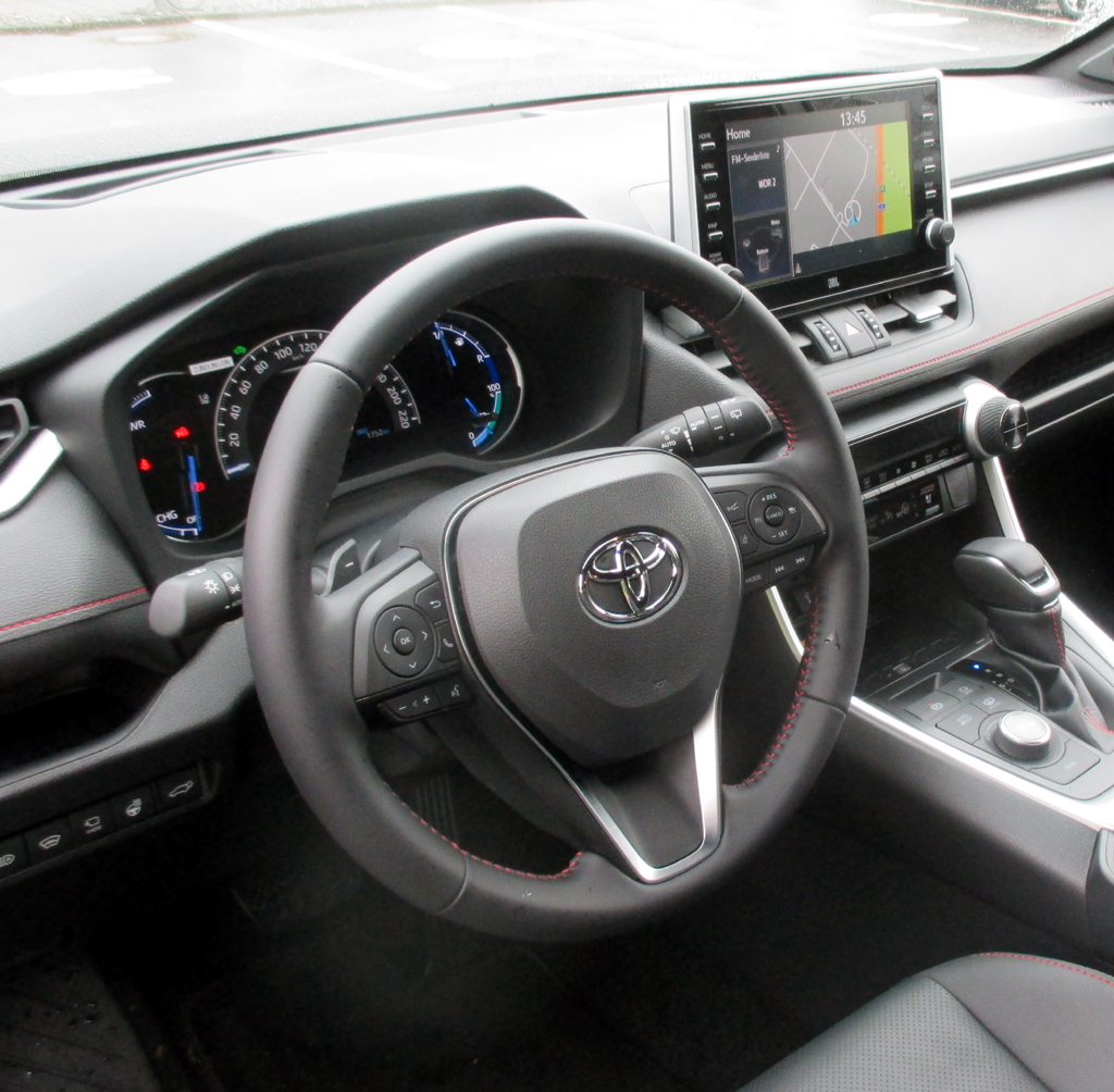 Die Ausstattung: Das Serienpaket ist etwa mit LED-Scheinwerfern, Kühlergrill mit dunklem Gitter, metallischer Einfassung der Frontschürze, dunklem Unterbodenschutz, Zweizonen-Klimaautomatik, Multimedia, Neunzoll-Touchscreen, Onlineservices, Smartphone-Integration, beheizbarem Lederlenkrad, Sitzheizung, Einparksensoren, Rückfahrkamera, Adaptivtempomat, Spurhalteassistenz, Verkehrszeichenerkennung, Anhängerstabilisierung sowie 18-Zoll-Leichtmetallrädern mit 225er-Reifen schon ziemlich umfangreich bestückt. Wer will, individualisiert den Wagen mit Technik- oder Stylepaket. Mit beiden zusammen ist dieser RAV4 dann brutto/netto ab 58 380/50 328 Euro zu haben.