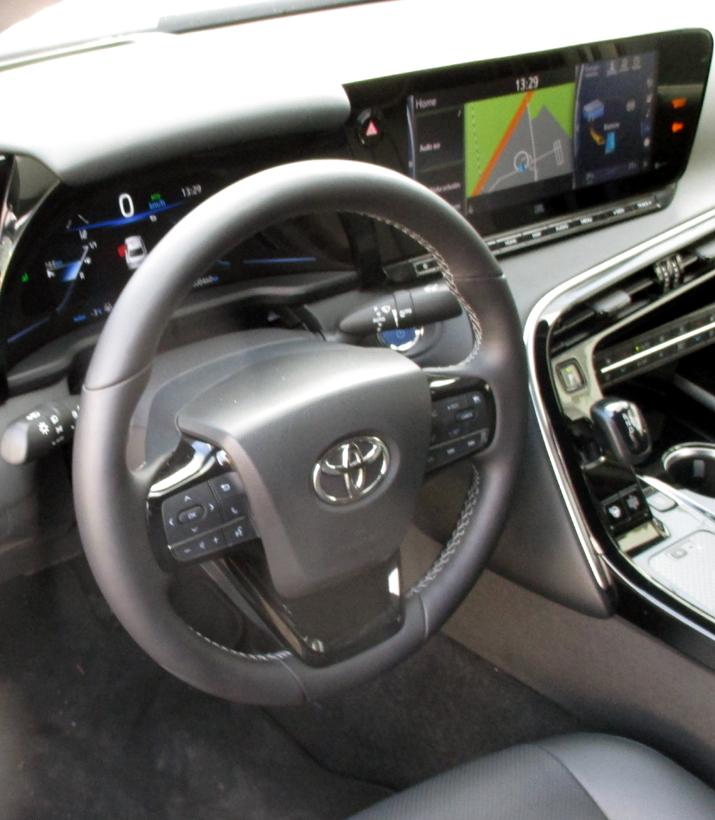 Der Antrieb: Herzstück ist zweifellos das kompaktere und leichtere System aus jetzt 330 (vorher 370) Brennstoffzellen mit deutlich gewachsener Leistungsdichte. In ihnen, quasi im eigenen Kraftwerk an Bord, reagieren Wasserstoff und Sauerstoff chemisch miteinander, geben die im Wasserstoff enthaltene Energie als Strom frei, der sich in der Batterie speichern lässt oder gleich den 182-PS-Elektromotor (vorher 154) antreibt, wobei als Nebenprodukt lokal keinerlei Schadstoffe entstehen, sondern bloß – reines Wasser. Die wichtigsten technischen Daten sonst: 335 Newtonmeter Drehmoment vom Start weg bis 3267 Touren. 9,2 Sekunden für die Beschleunigung aus dem Stand auf Tempo 100. Höchstgeschwindigkeit 175 Stundenkilometer. Hochvolt-Lithium-Ionen-Akku. Die Reichweite geben die Japaner mit bis zu 650 (vorher bis zu 450) Kilometern an. „Immerhin 30 Prozent mehr“, rechnet Heidbrink vor, weist auf die neue Plattform mit verbesserter Antriebsanordnung und drittem Tank für plus 20 Prozent Wasserstoff hin, dessen Verbrauch sich mit 0,79 bis 0,89 Kilo so zumindest im Datenblatt findet. Einmal Volltanken soll „weniger als fünf Minuten“ dauern.