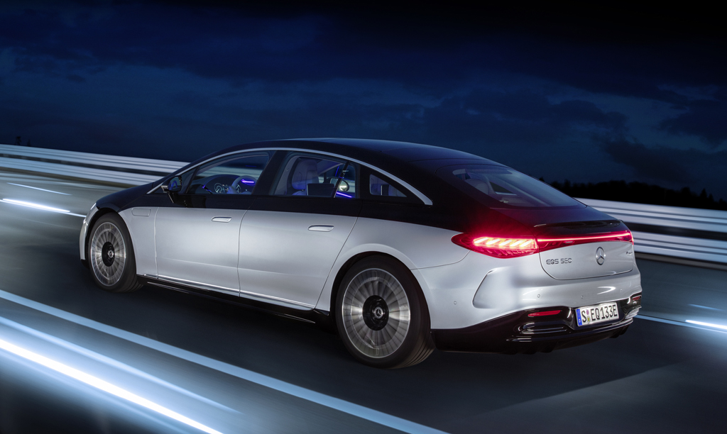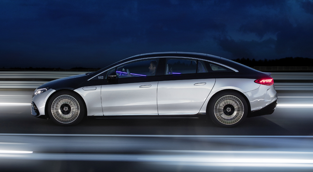 Die Rückleuchten haben eine besondere Lichtsignatur. Und so sieht der EQS von der Seite aus.