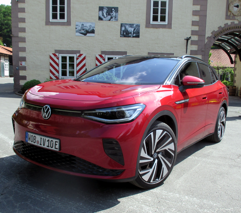 Die Ausstattung: LED-Matrix-Scheinwerfer sind Serie. Dioden in den Lufteinlässen ergänzen die Lichtsignatur nachts. Am Heck leuchten neuartige 3D-LED zurück. Touchdisplay mit bis zu zwölf Zoll großer Diagonale, natürliche Sprachbedienung mit Online-Anbindung sind ebenso Standard wie das Multifunktionslederlenkrad mit Touchbedienung und 20-Zoll-Leichtmetallräder. Die Sitze kombinieren Stoffbezüge mit roten Nähten und Applikationen aus Kunstleder. Nach der „Aktion Gesunder Rücken“ zertifizierte, elektrisch einstellbare Sportsitze mit hohen Wangen, integrierten Kopfstützen, Lendenwirbelstütze, Massagefunktion und teils recyceltem Mikrofasergewebe sind lieferbar. Wer will, kann das Headup-Display ordern, das ausgewählte Anzeigen mit der Wirklichkeit verbindet. „Discover Pro“-Navigation, Onlinedienste und moderne elektronische Hilfen erleichtern das Fahren. Aufgrund der neuen Elektronikplattform sollen künftig „Over the Air“-Updates“ als immer wiederkehrende Aktualisierungen der Software möglich sein. Wie beim normalen ID4 stehen fünf Ausstattungspakete – Design, Comfort, Infotainment, Assistence, Sport – zur Wahl, die auch in einer Plus-Variante zu haben sind. Design- und Comfort-Pakete etwa umfassen Panorama-Glasdach, Seitenfenster vorn aus Akustikglas, Privacy-Verglasung hinten, beheizbare Vordersitze, Zwei- oder Drei-Zonen-Klimaautomatik und doppelter Ladeboden.