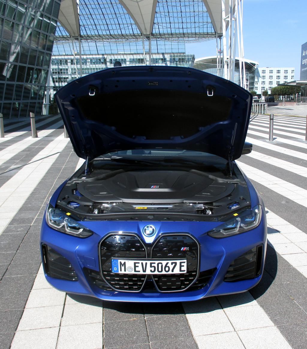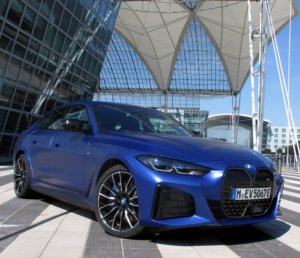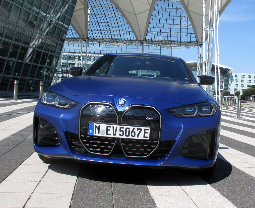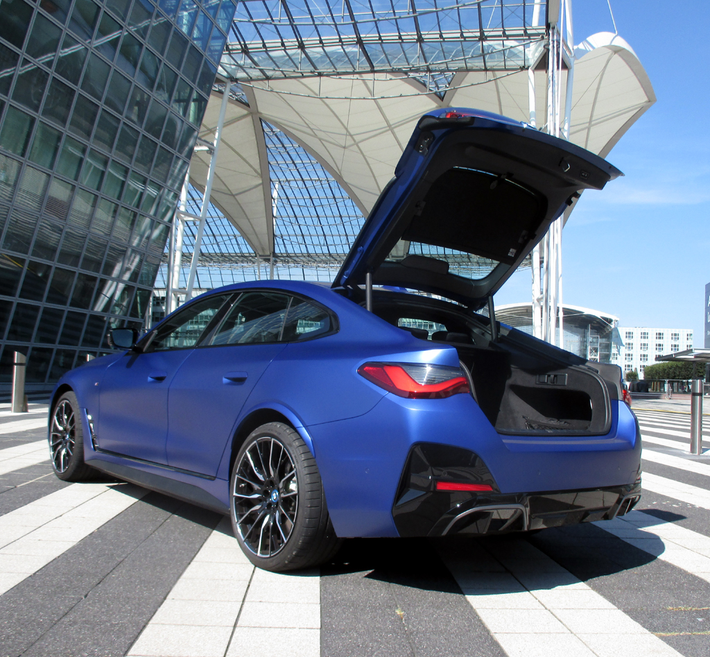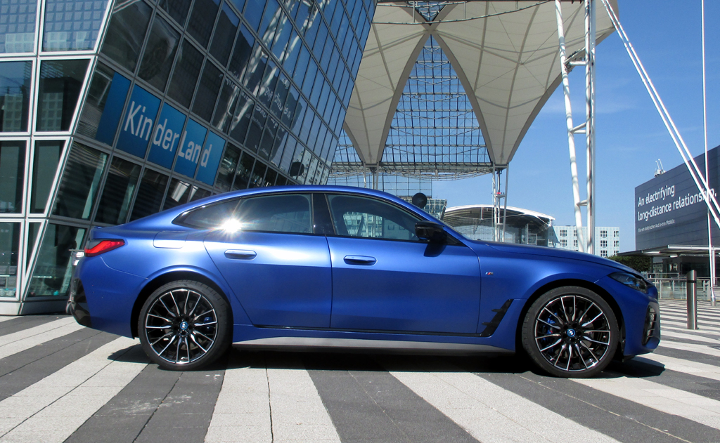 Das Auto: Coupé und Cabrio als emotionalere Varianten hat BMW einst aus der 3er-Baureihe herausgelöst, damit die 4er-Modellfamilie aufgemacht, die nun um die i4 – 4,78 Meter lang, 1,85/,2,07 Meter breit, 1,45 Meter hoch, Kofferraum 470 bis 1290 Liter – als 4er-Derivate Nummer sieben und acht weiter wächst. Basis ist eine flexible, von Beginn an für reinen Elektroantrieb konzipierte Fahrzeugarchitektur mit langem 2,85-Meter-Radstand und großen Spurweiten. Die im i-Blau akzentuierte Front mit markanter Doppelniere und flachen Scheinwerfern ist weitgehend geschlossen. Das Gran-Coupé-Konzept mit gestreckten Proportionen, fließender Dachlinie, Türen mit rahmenlosen Scheiben undgroßer Heckklappe wirkt sportlich. Innen geht es durchaus luxuriöser zu. Das Raumangebot lässt sich variabel nutzen. Die Mittelkonsole mit Bedienfeld für Getriebewählhebel, Controller und Funktionstasten ist modern gestaltet. Zum Cockpit gehört der volldigitale Verbund aus 12,3-Zoll-Informations- und 14,9-Zoll-Kontrolldisplay. Die Elektro-4er laufen im Werk München vom Band.